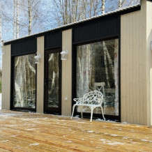 Дом отвернут от территории глэмпинга, поэтому из огромных панорамных окон открывается вид на заповедный лес. И ещё один бонус - личный сад окруженный хвойными деревьями.
