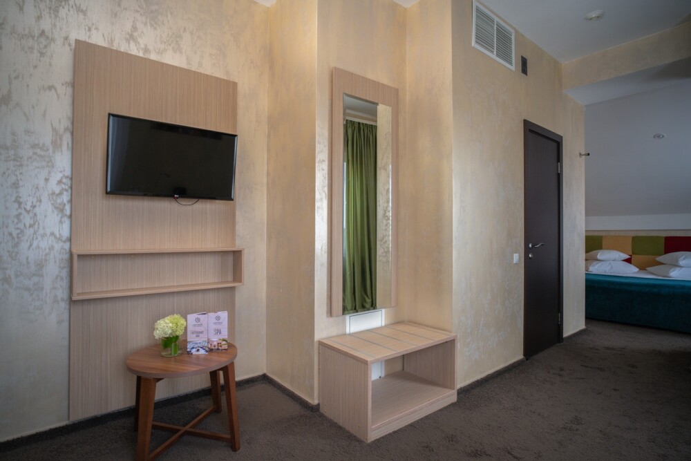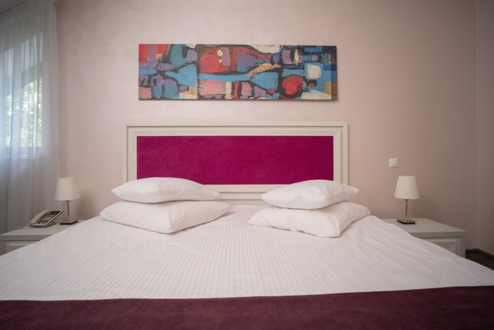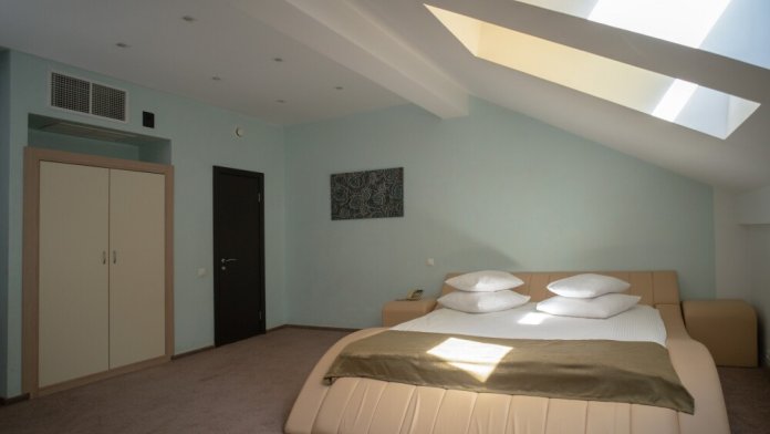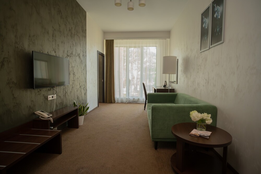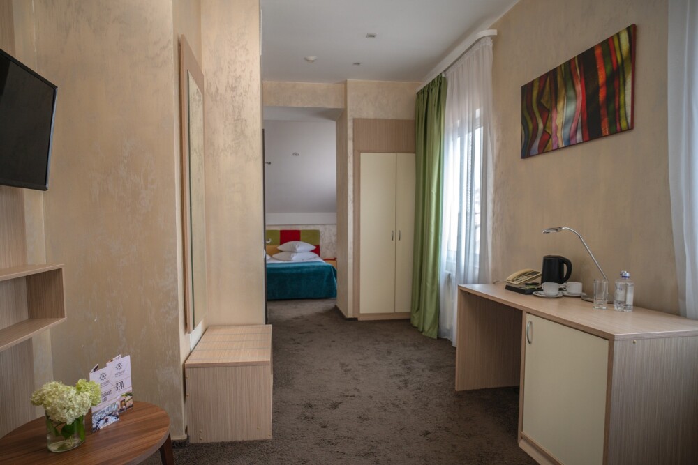 Двухкомнатный номер категории «Люкс» располагает спальню и гостиную с балконом. Подходит для комфортного проживания и оснащен всем необходимым.