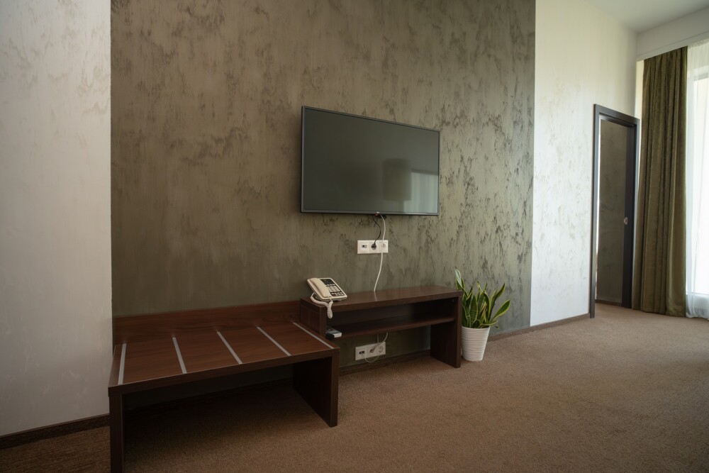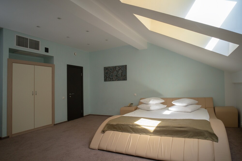 Однокомнатные номера категории «Стандарт» подходят для комфортного размещения 2 гостей и оснащены всем необходимым для проживания: удобными креслами и журнальным столиком, полноценным рабочим местом, шкафом, двуспальной кроватью king-size, телевизором, мини-баром и индивидуальным санузлом (с душевой кабиной).