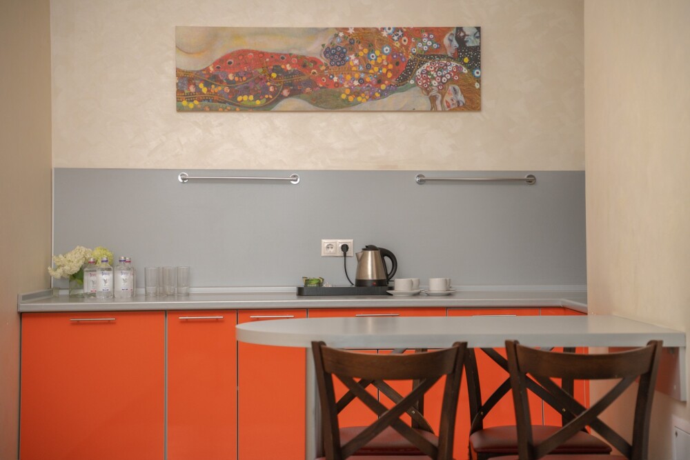 Однокомнатные апартаменты с мини-кухней категории «Studio» подходят для комфортного размещения 2 гостей и оснащены всем необходимым для проживания: полноценным рабочим местом, шкафом, двуспальной кроватью king-size, телевизором, мини-баром и индивидуальным просторным санузлом (с ванной). Возможна организация 1 дополнительного места за отдельную плату.