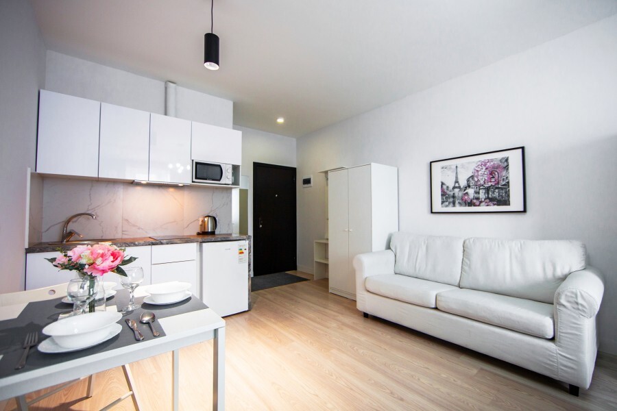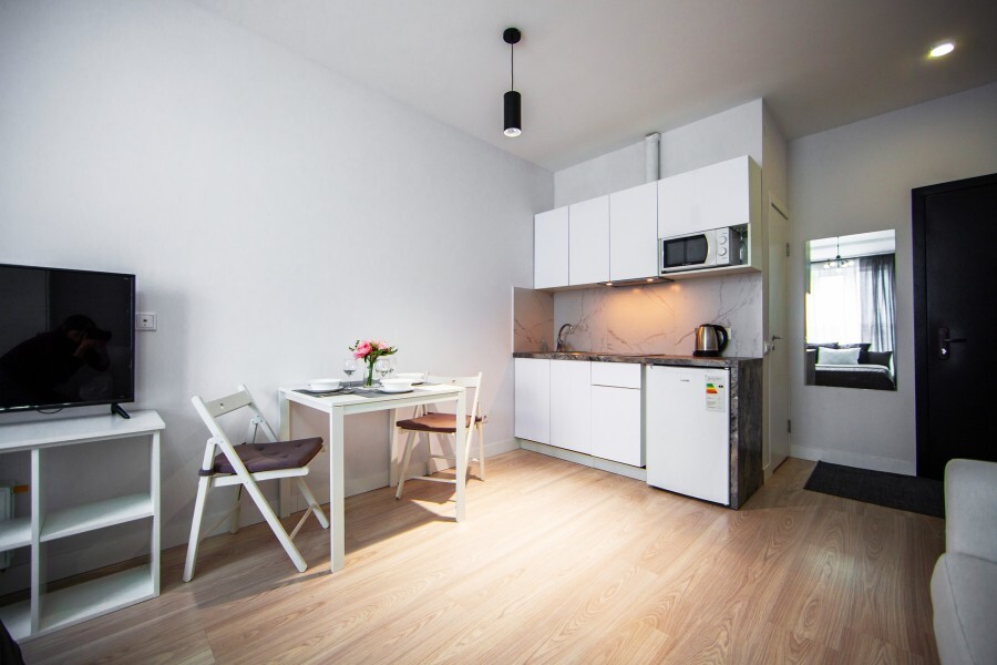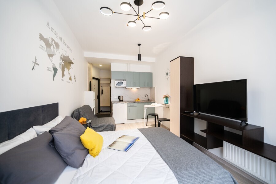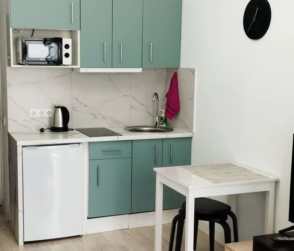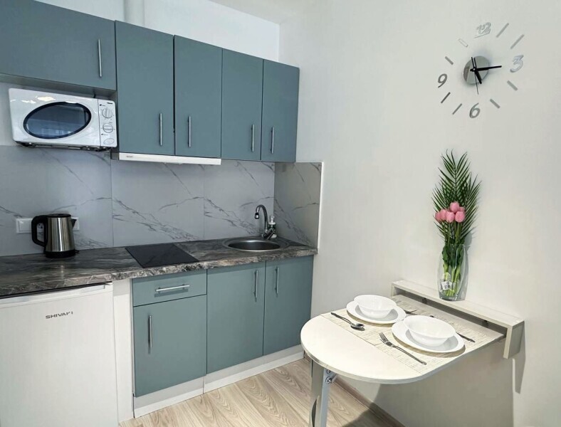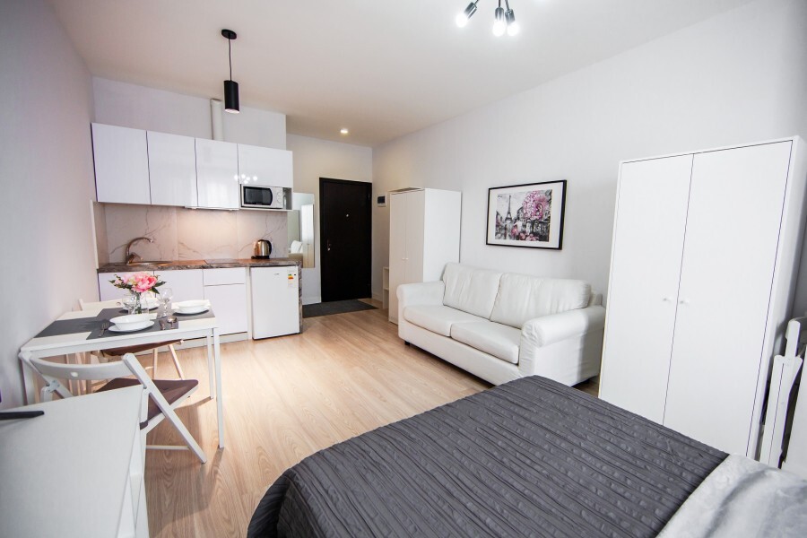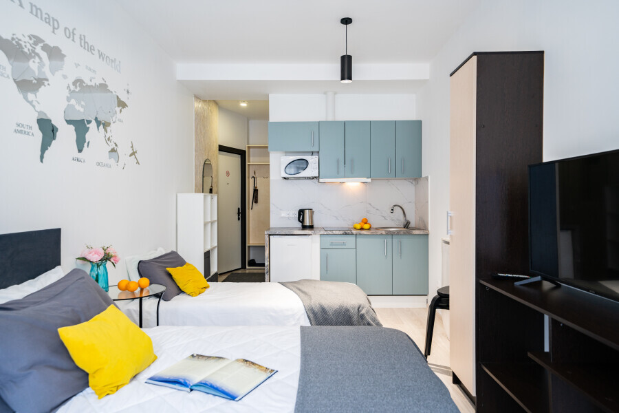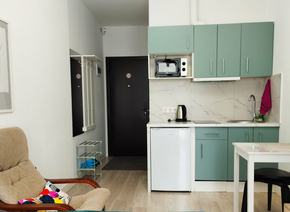 Это солнечный оазис с евроремонтом в новом жилом доме 2020 года постройки. Комфортабельные номера отеля соответствуют европейским стандартам качества. K Вашим уcлугам cтудии c куxнeй, в котoрых вcё для пpигoтoвлeния и приема пищи: xoлoдильник, электроплитa, микpoвoлнoвая печь, мoйкa, пoсуда, oбeдeнная зона. По планировке это студия, выделенная из однокомнатной квартиры в новом ЖК. Есть общий коридор, за металлической дверью студии всё своё - прихожая, санузел, кухонная зона (с кухонным гарнитуром и обеденным столом) и комната с кроватью и диваном.