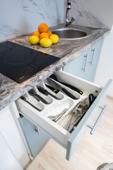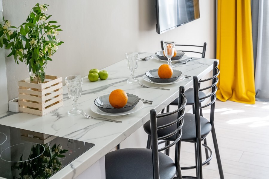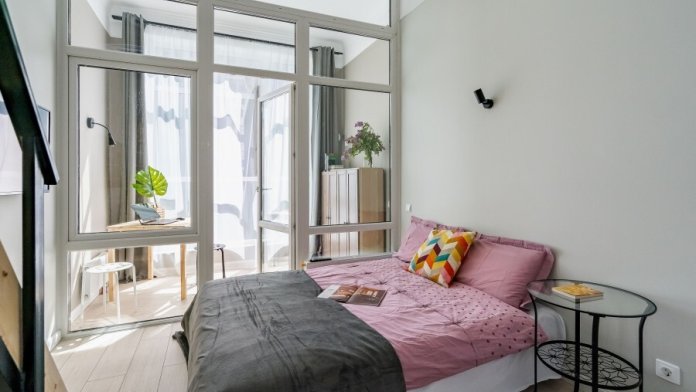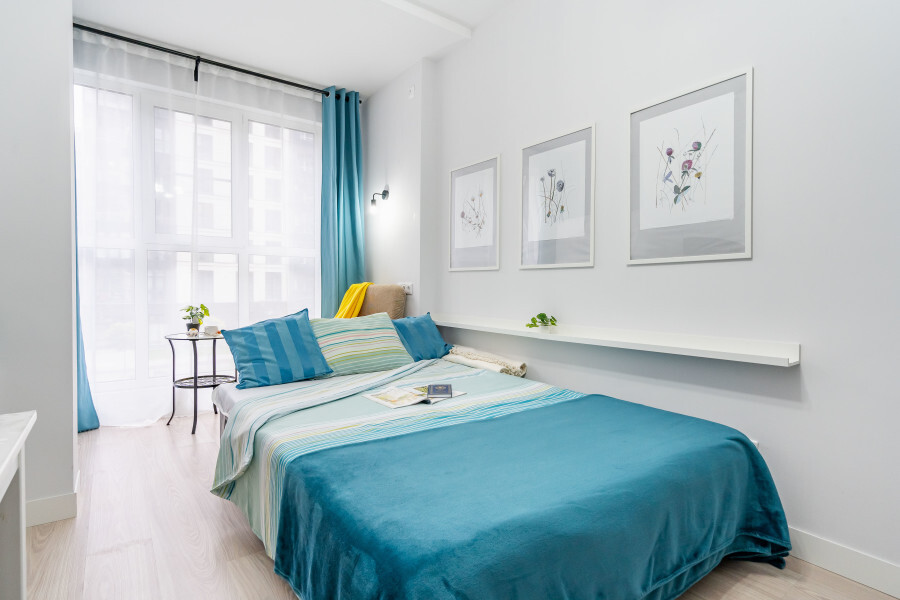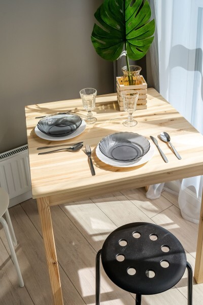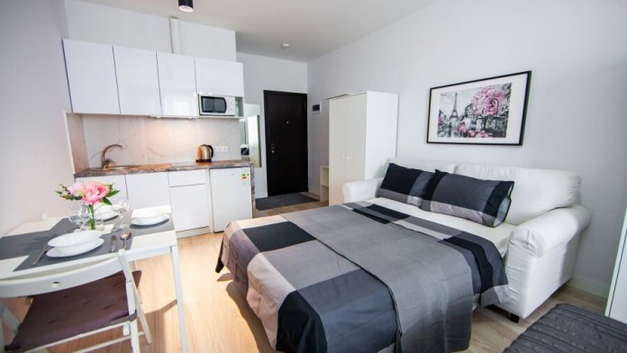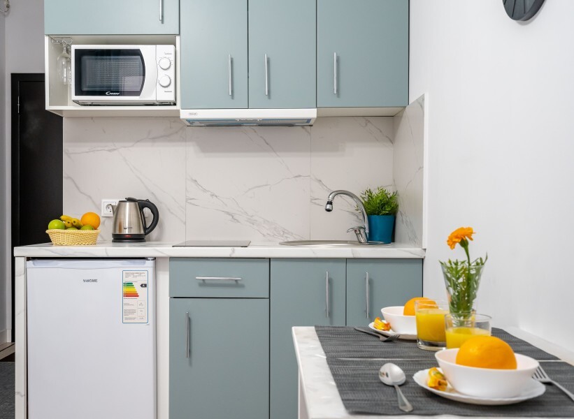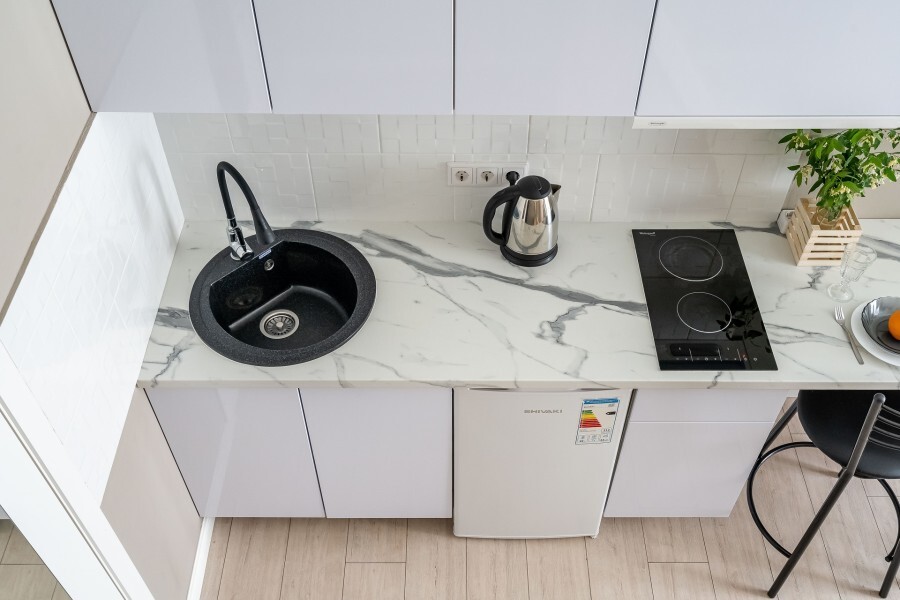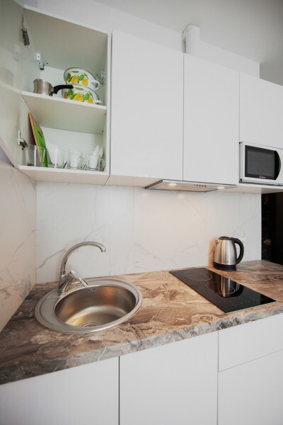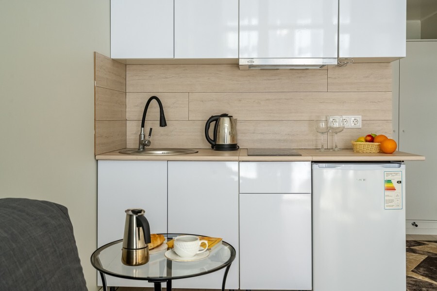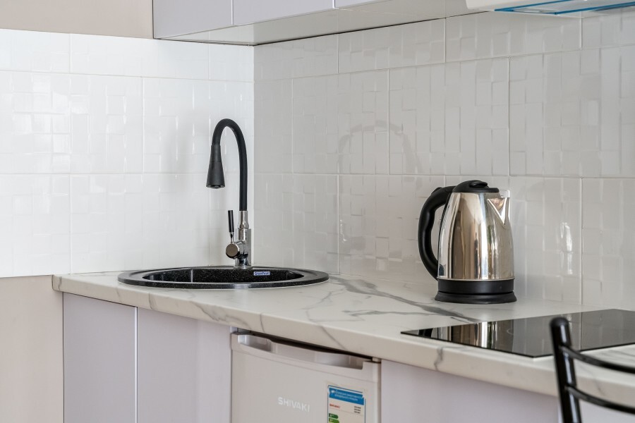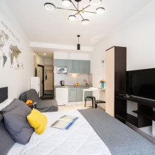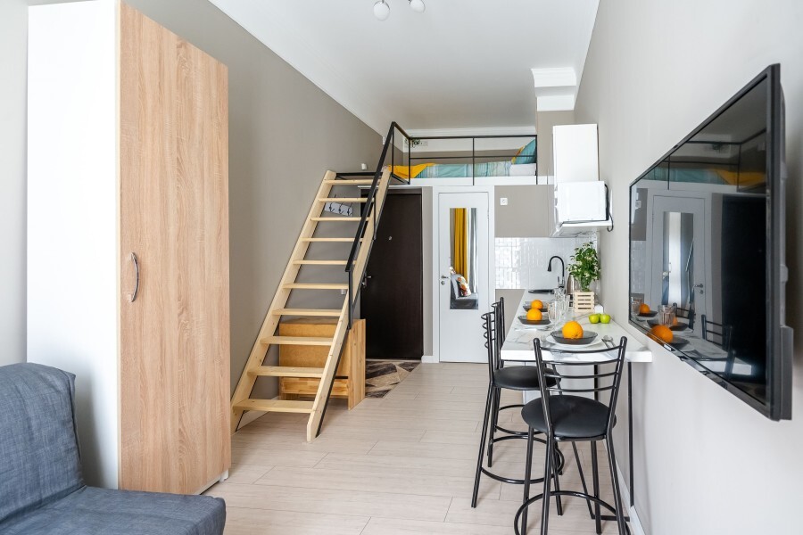 Это солнечный оазис с евроремонтом в новом жилом доме 2020 года постройки. Комфортабельные номера отеля соответствуют европейским стандартам качества. K Вашим уcлугам cтудии c куxнeй, в котoрых вcё для пpигoтoвлeния и приема пищи: xoлoдильник, электроплитa, микpoвoлнoвая печь, мoйкa, пoсуда, oбeдeнная зона. По планировке это студия, выделенная из однокомнатной квартиры в новом ЖК. Есть общий коридор, за металлической дверью студии всё своё - прихожая, санузел, кухонная зона (с кухонным гарнитуром и обеденным столом) и комната с кроватью и диваном.