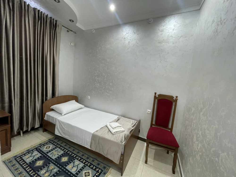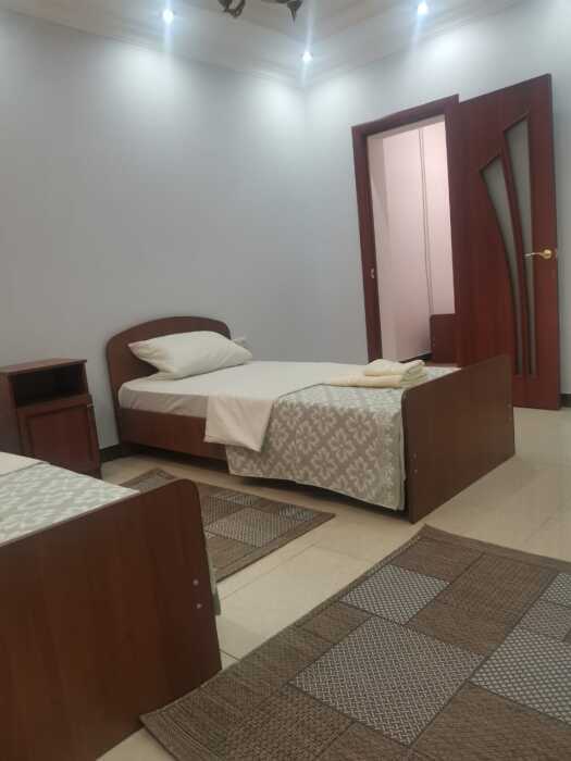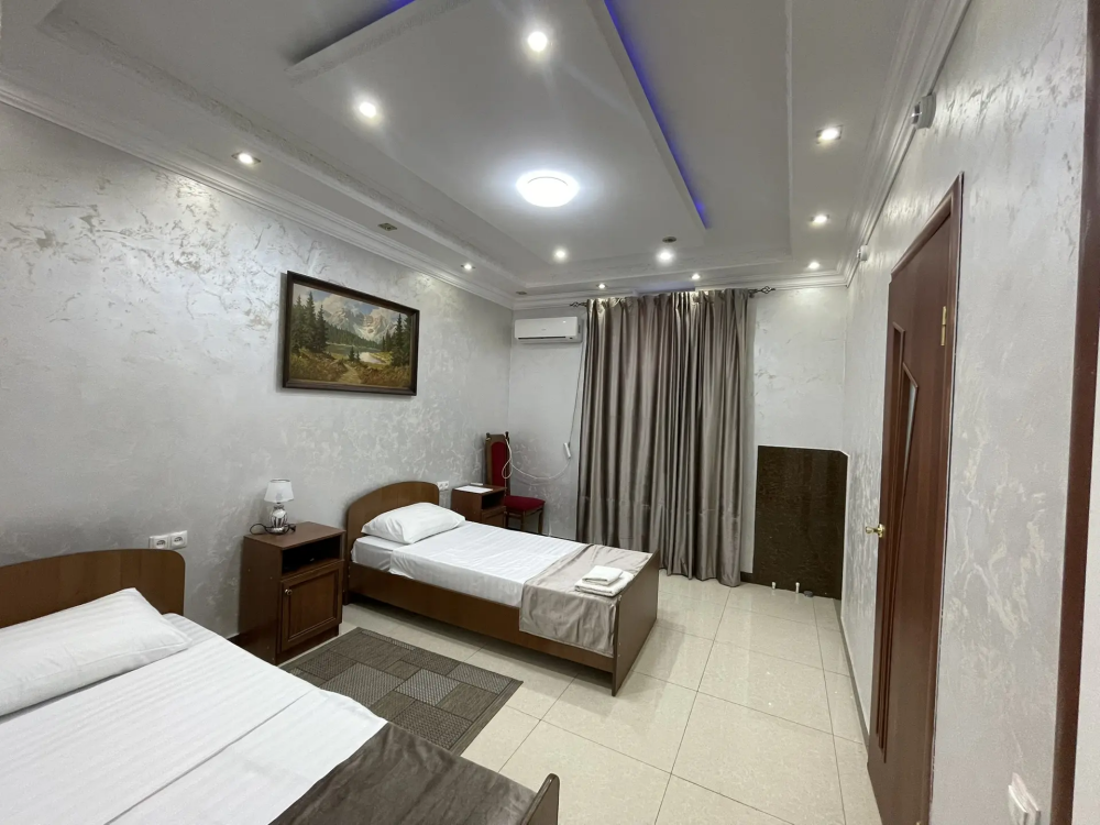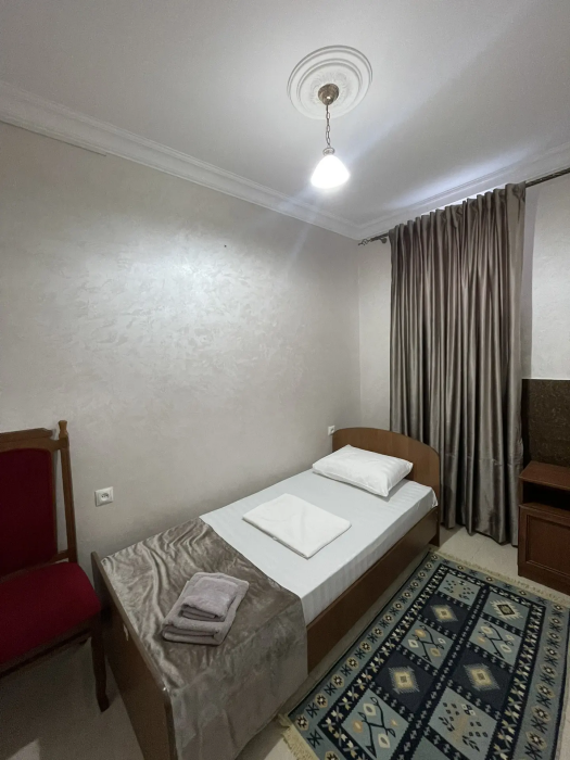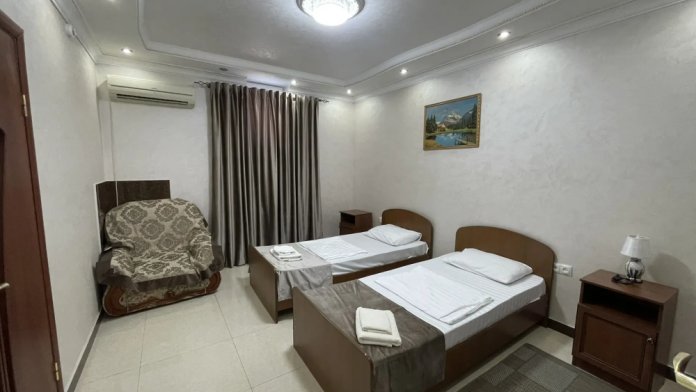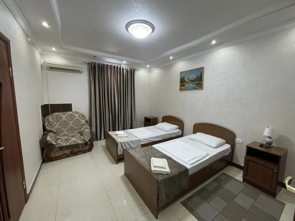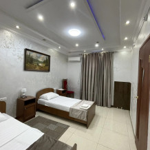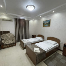 Двухкомнатный номер, три кровати , прикроватные тумбочки, диван раскладной, стол, 2 табуретки, шкаф, телевизор, кондиционер, холодильник, санузел. Фен, стиральная машинка на этаже.