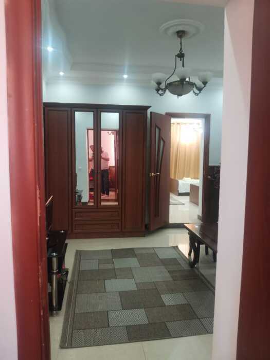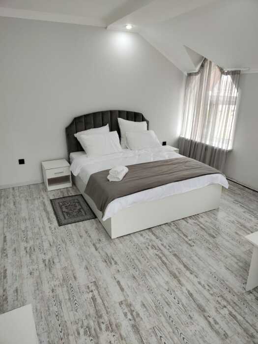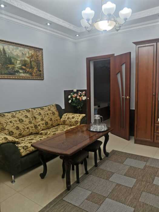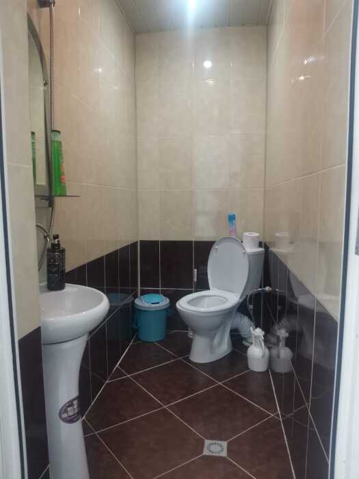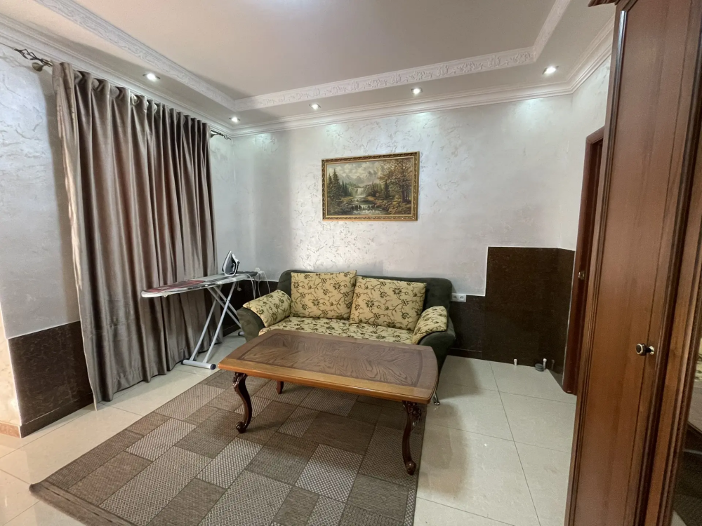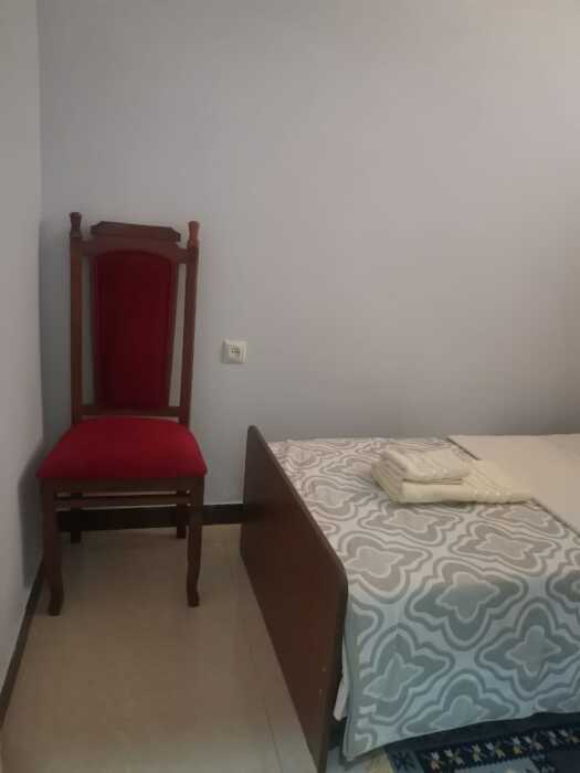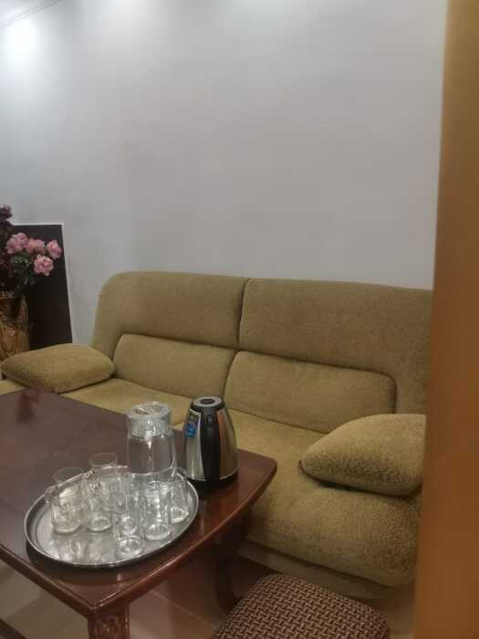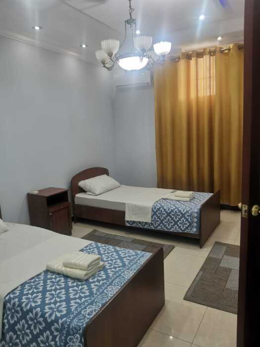 Двухкомнатный номер, три кровати , прикроватные тумбочки, диван раскладной, стол, 2 табуретки, шкаф, телевизор, кондиционер, холодильник, санузел. Фен, стиральная машинка на этаже.