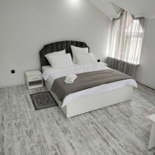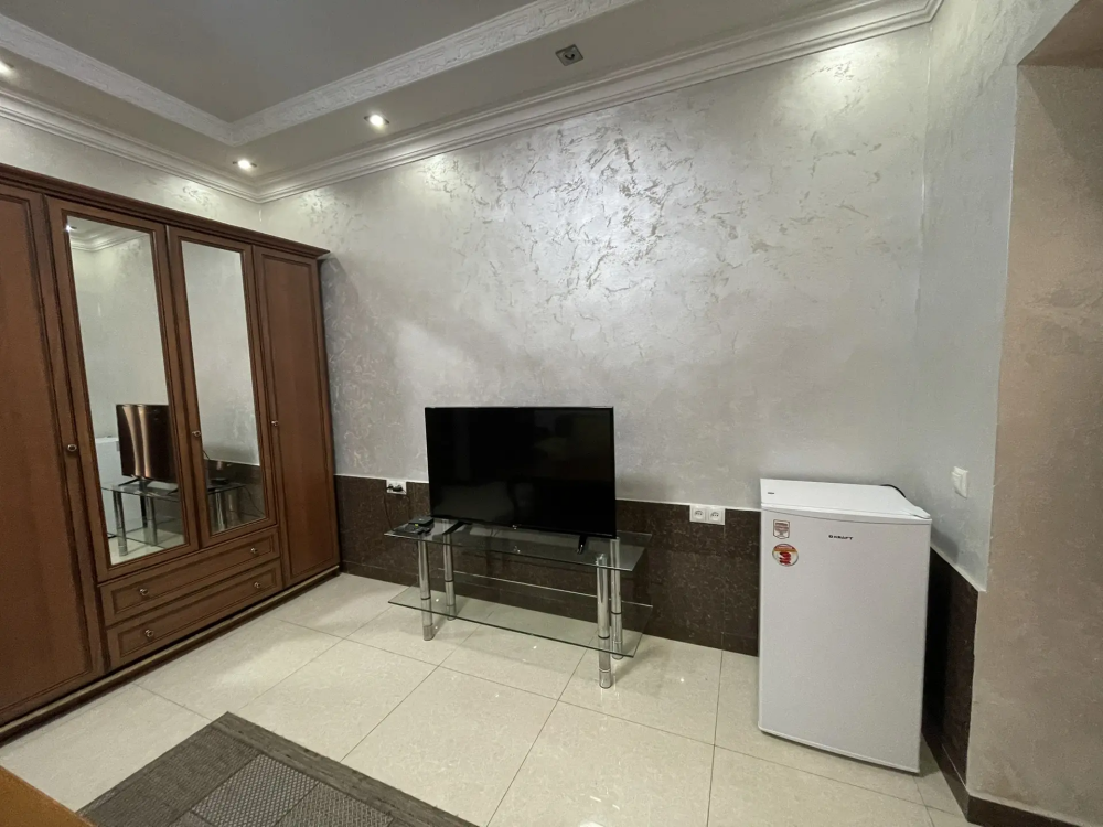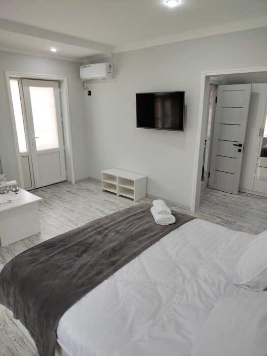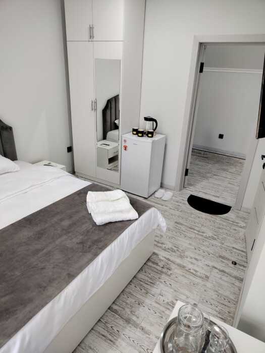 Двуспальная кровать, шкаф, стол, два пуфа, телевизор, кондиционер, санузел в номере, фен, комплект полотенец, чайник электрический. На этаже стиральная машинка, микроволновая печь, мини кухня.