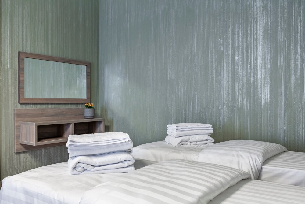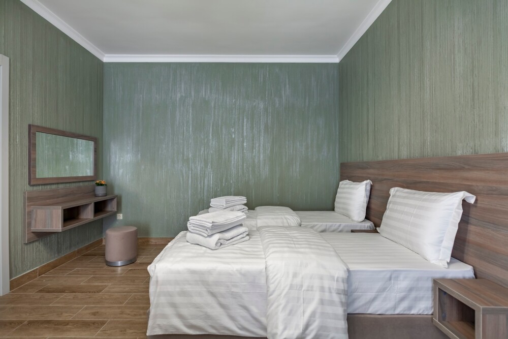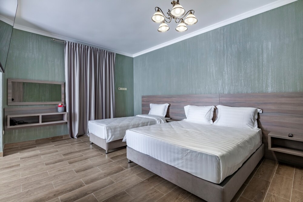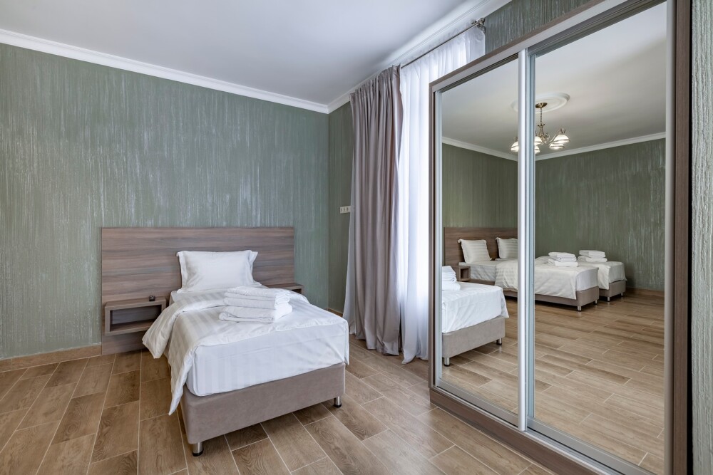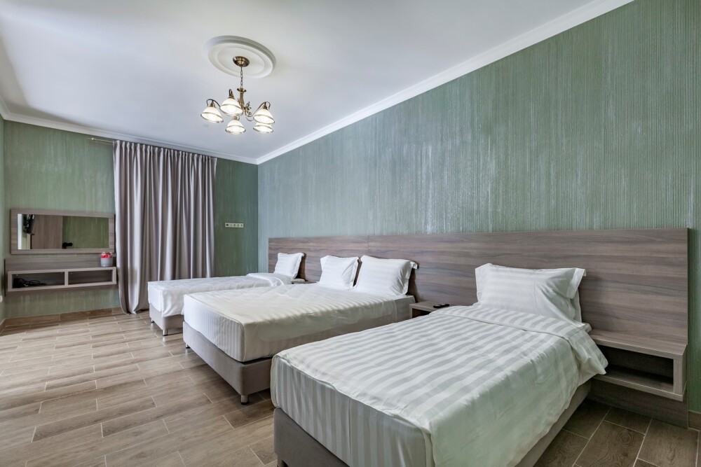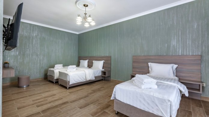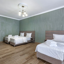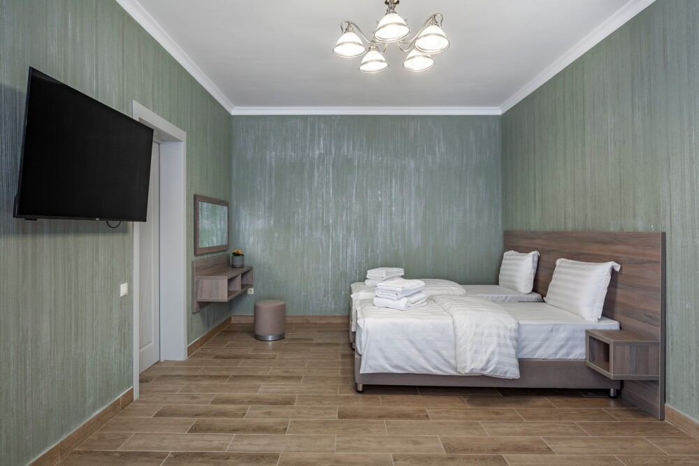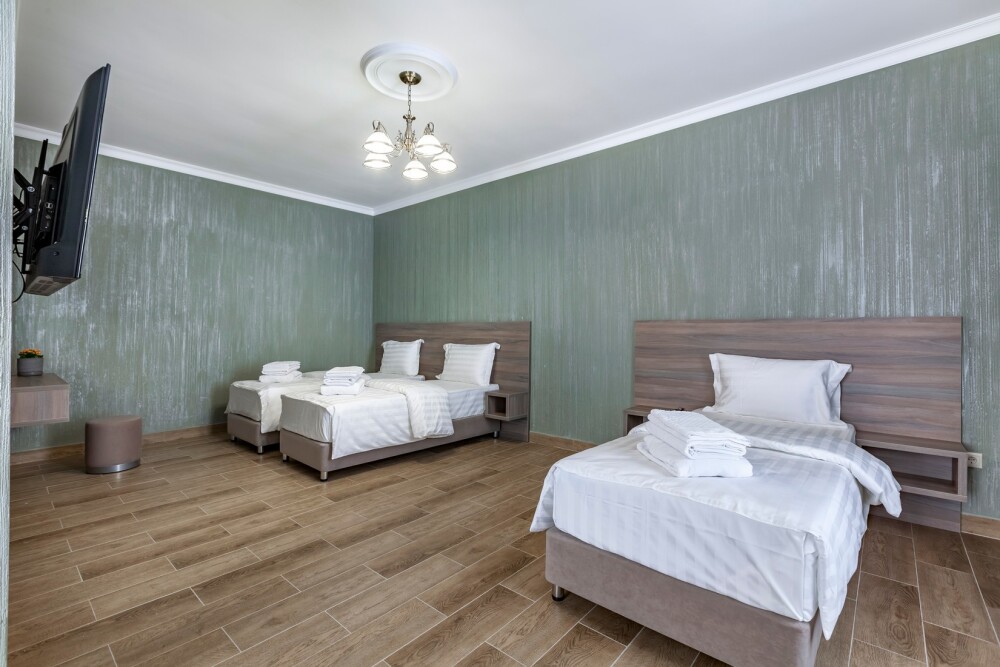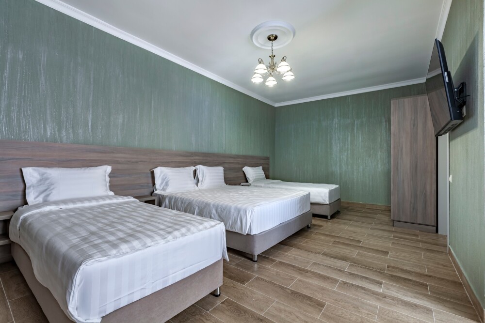 В номере: 2 односпальные кровати, 1 двуспальная кровать