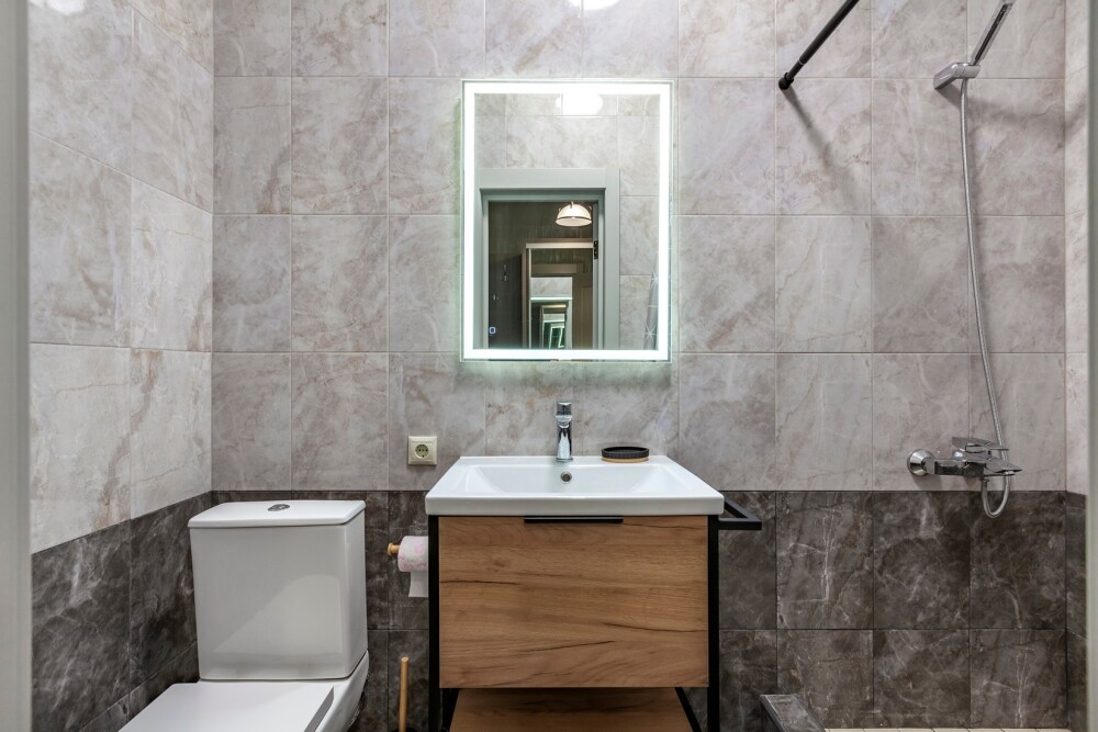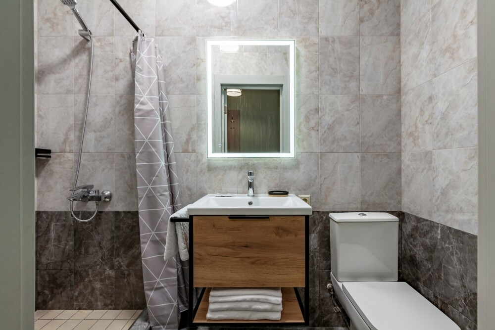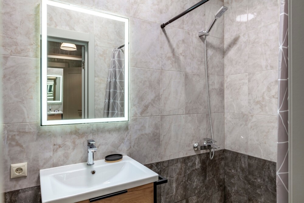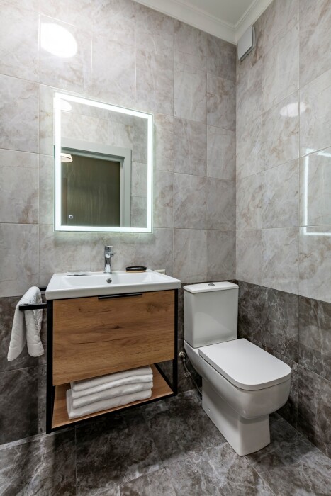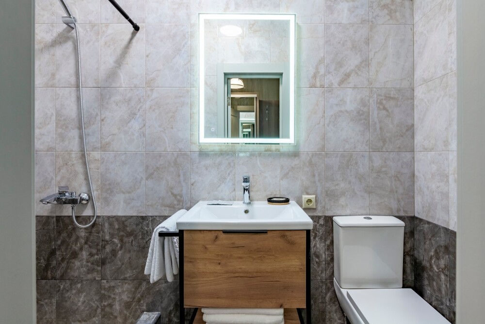 Индивидуальная ванная комната: душ, раковина, туалет, халат, тапочки, фен, утюг, гладильная доска, шампунь.