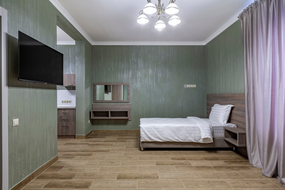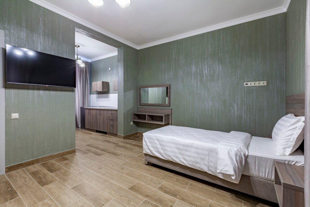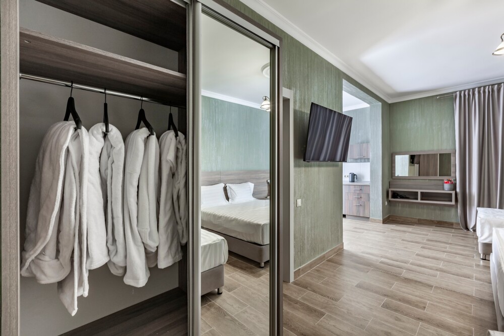 Имеется: мини кухня, посуда, телевизор, кондиционер, вентилятор, шкаф, вешалка, стол, стулья, чайник, холодильник.