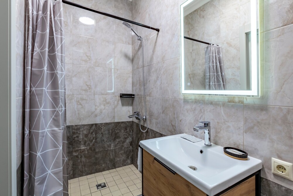 Индивидуальная ванная комната: душ, раковина, туалет, халат тапочки, фен, утюг, гладильная доска, шампунь.