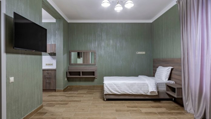 Имеет спальню с приятным интерьером.