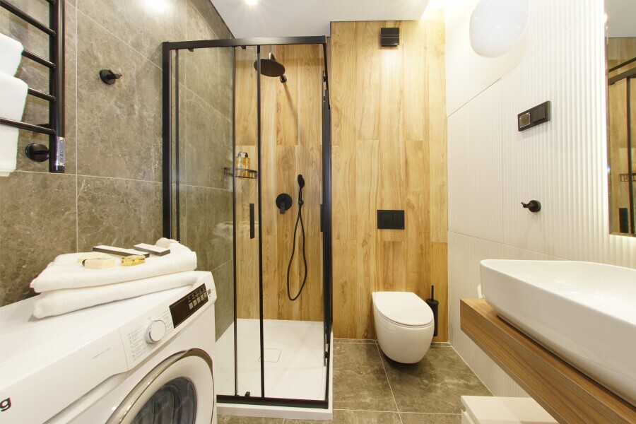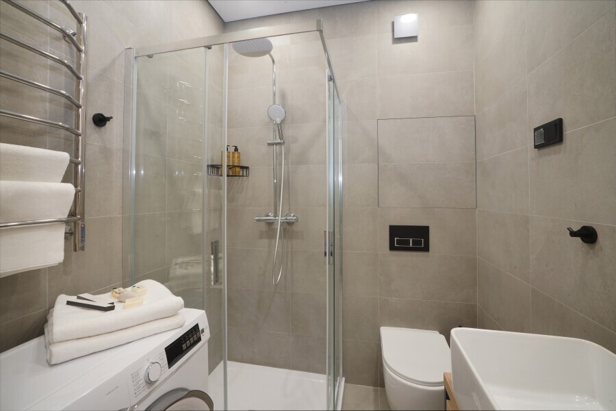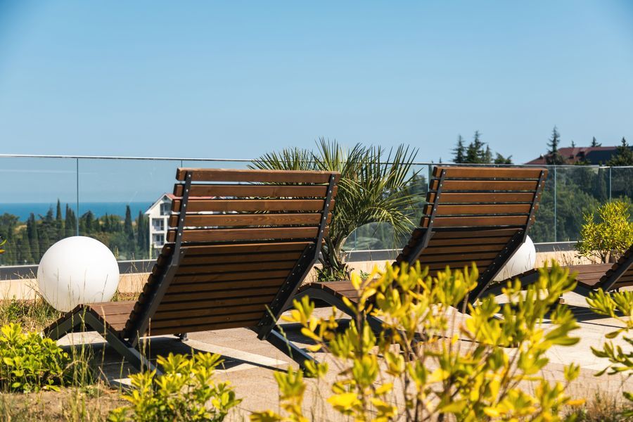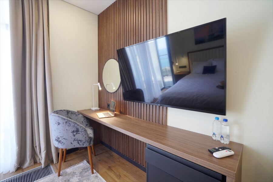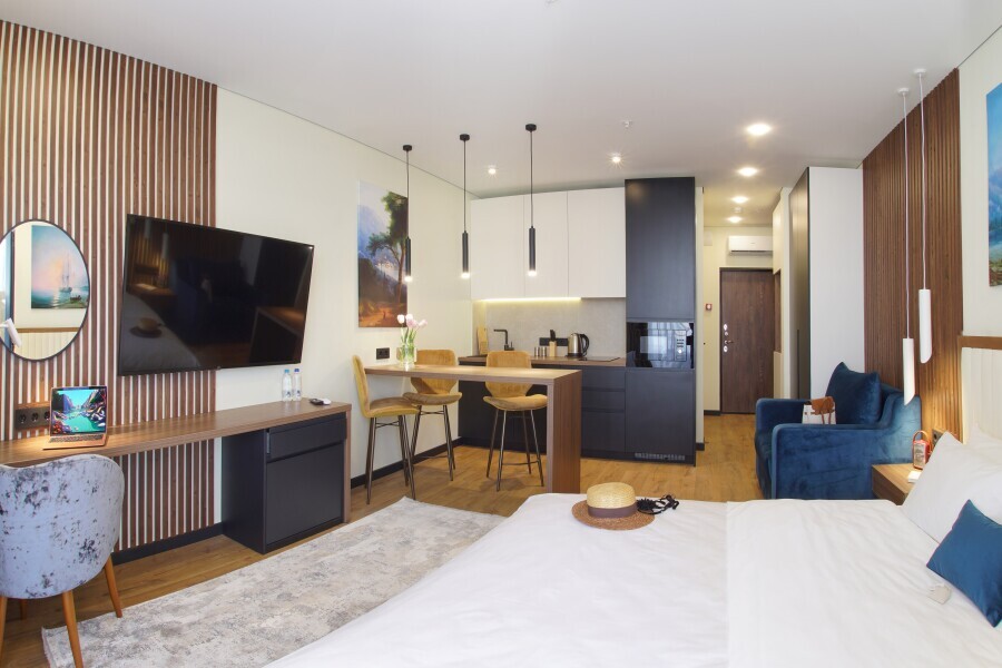 Все апартаменты имеют телевизоры со Smart TV и выход на собственную террасу, где каждый гость может проводить уютные вечера с близкими. Гостям предоставляются халаты по запросу, тапочки можно приобрести на ресепшне.