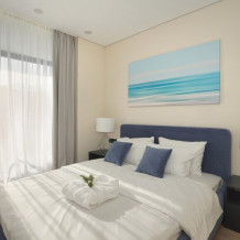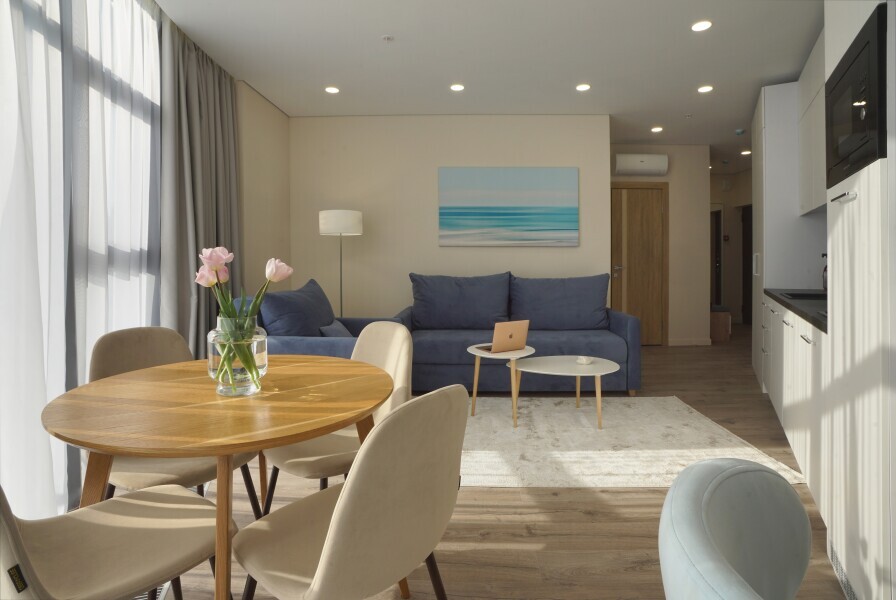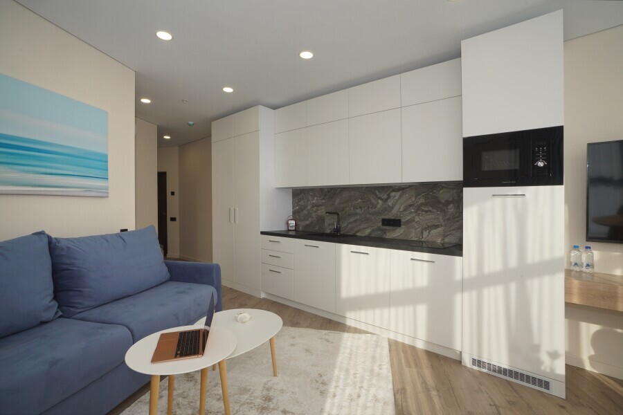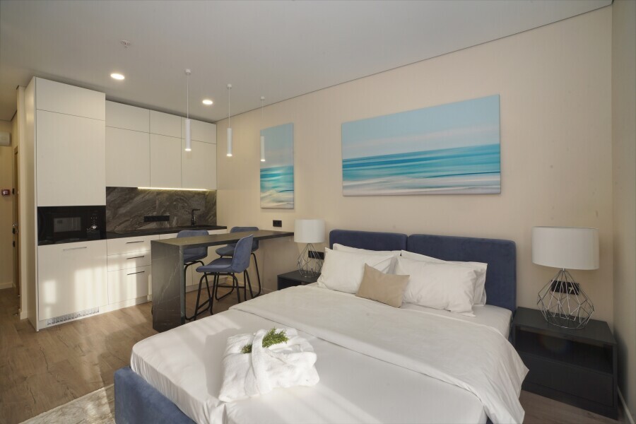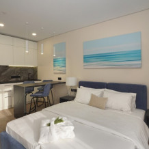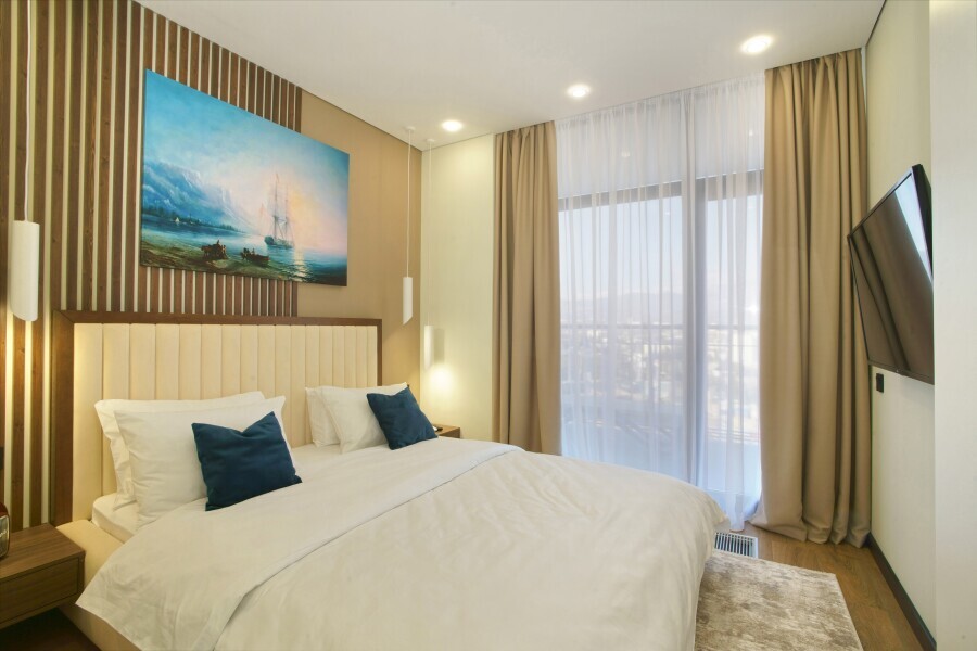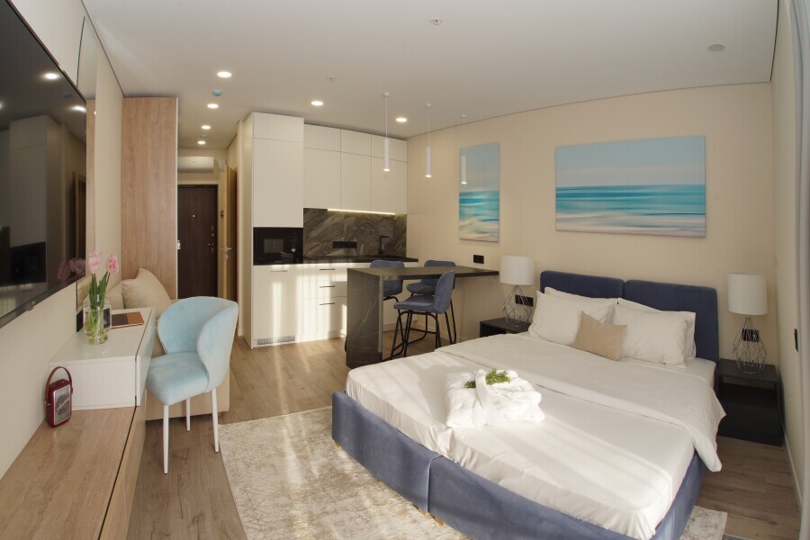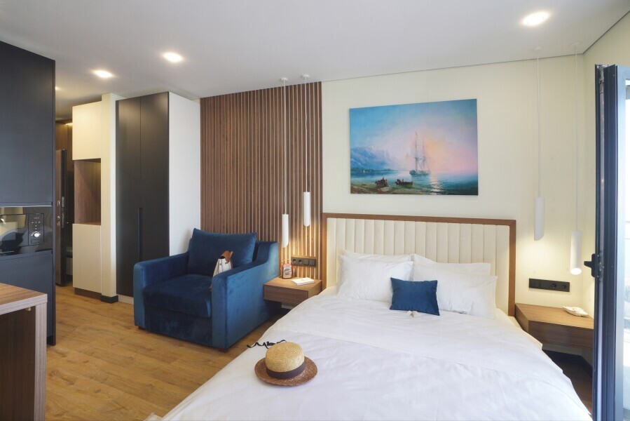 Комфортные двухкомнатные апартаменты в элегантном дизайне, каждый с балконом и видом на море. Отдельная спальня с двуспальной кроватью и пространство гостиной с диваном (раскладывается) и кухонной, обеденной зоной. Оснащение номера и мебель: рабочее пространство, шкаф, сушильная машина, утюг.