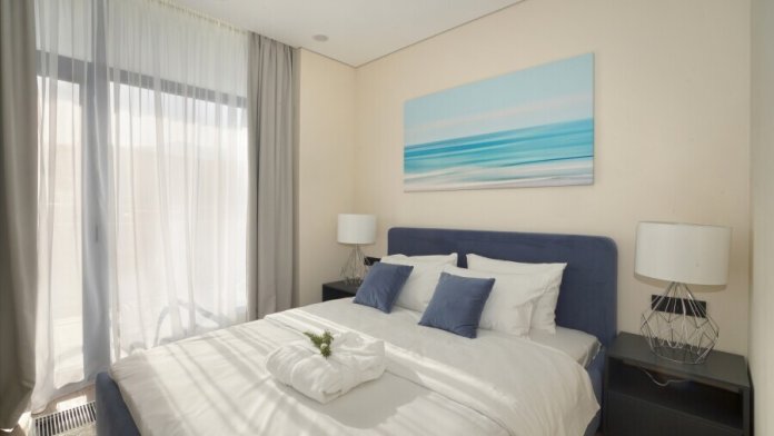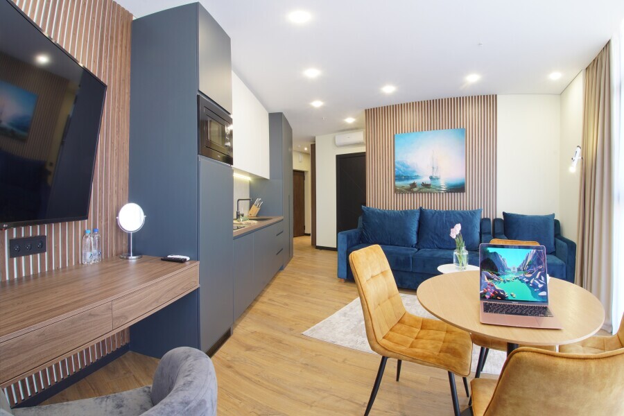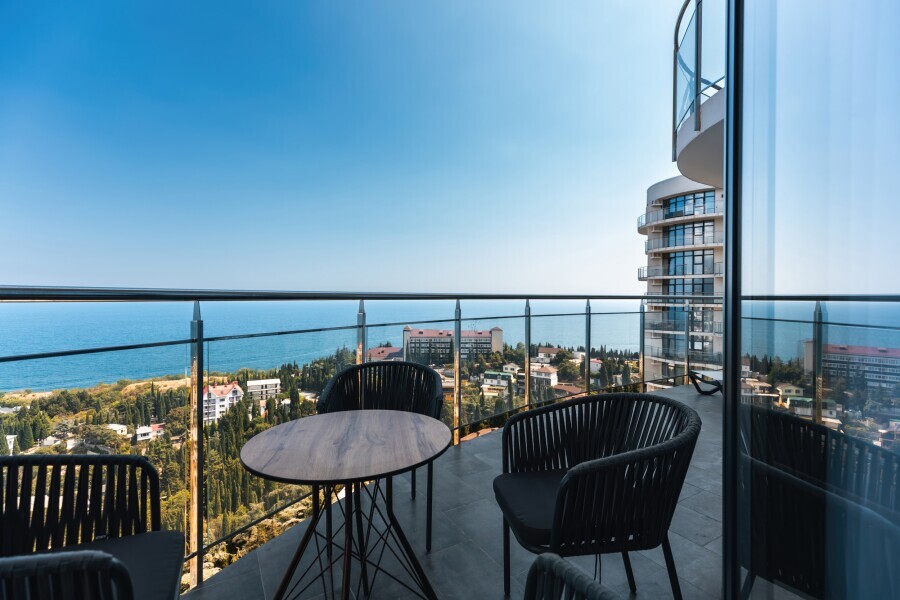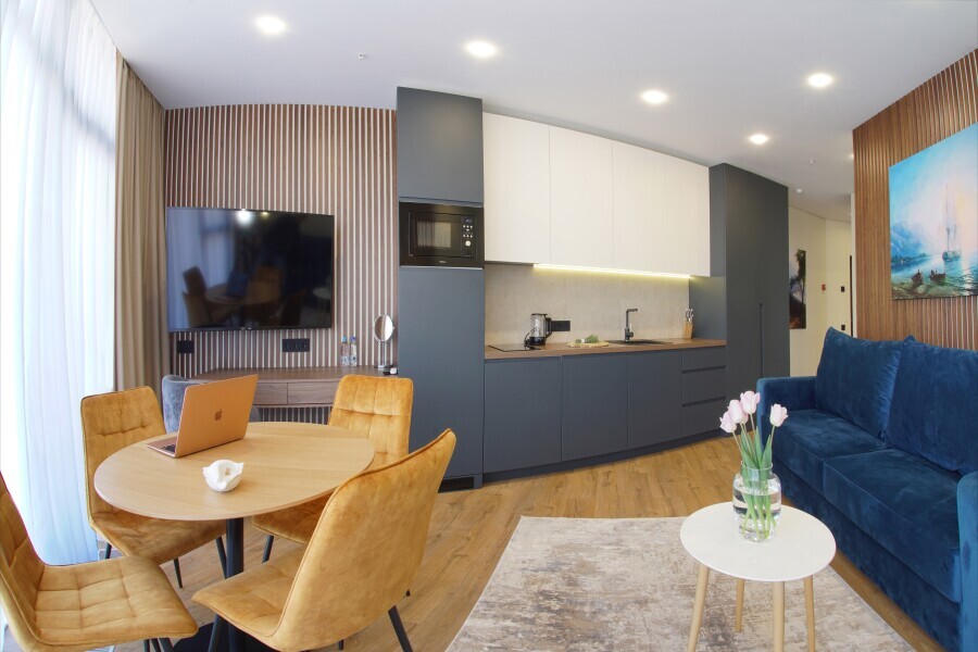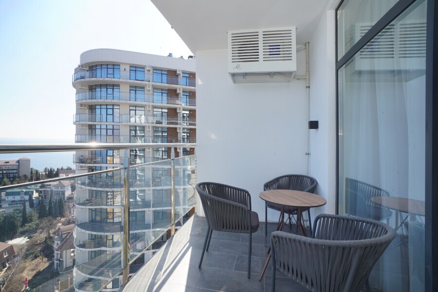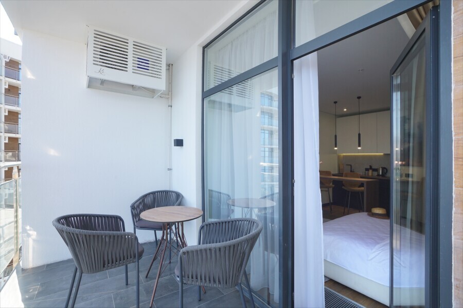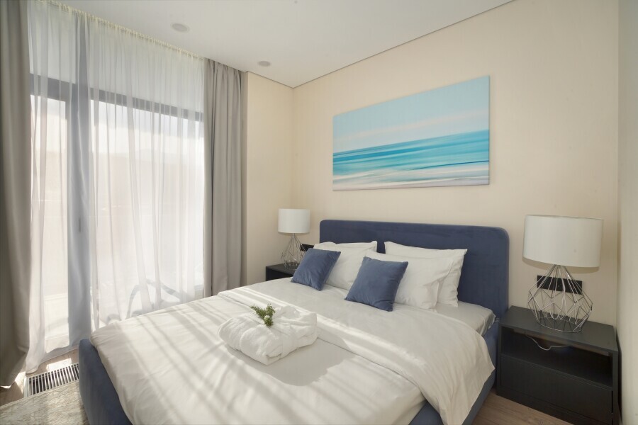 Комфортные двухкомнатные апартаменты в элегантном дизайне, каждый с балконом и видом на море. Отдельная спальня с двуспальной кроватью и пространство гостиной с диваном (раскладывается) и кухонной, обеденной зоной. Оснащение номера и мебель: рабочее пространство, шкаф, сушильная машина, утюг.