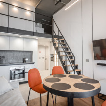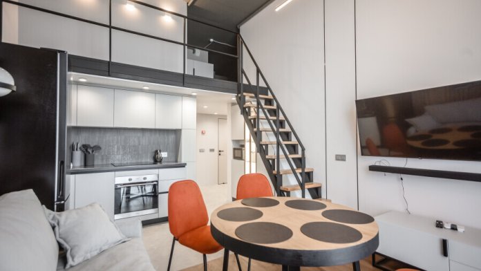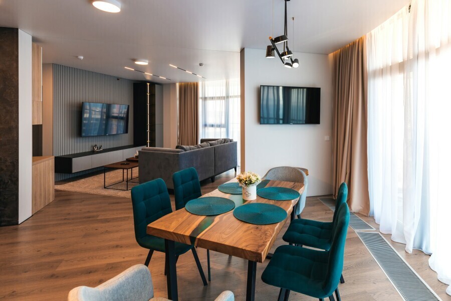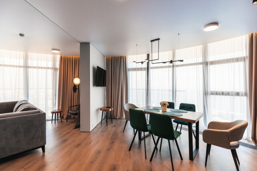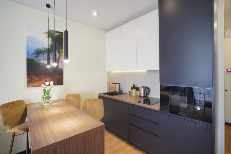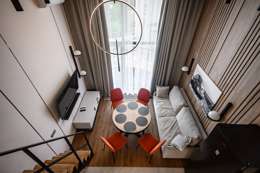 Этот стильный и современный двухуровневый апартамент идеально подходит для тех, кто ищет комфорт и роскошь в одном флаконе. Просторная гостиная, оформленная в современном стиле, с высокими потолками и выходом на балкон. Полностью оборудованная кухня с качественной техникой и современными удобствами, идеальная для кулинарных экспериментов и семейных сборов. На верхнем уровне расположены 2 уютные спальни и рабочая зона. Оснащение номера и мебель: рабочее пространство, шкаф, сушильная машина, утюг.