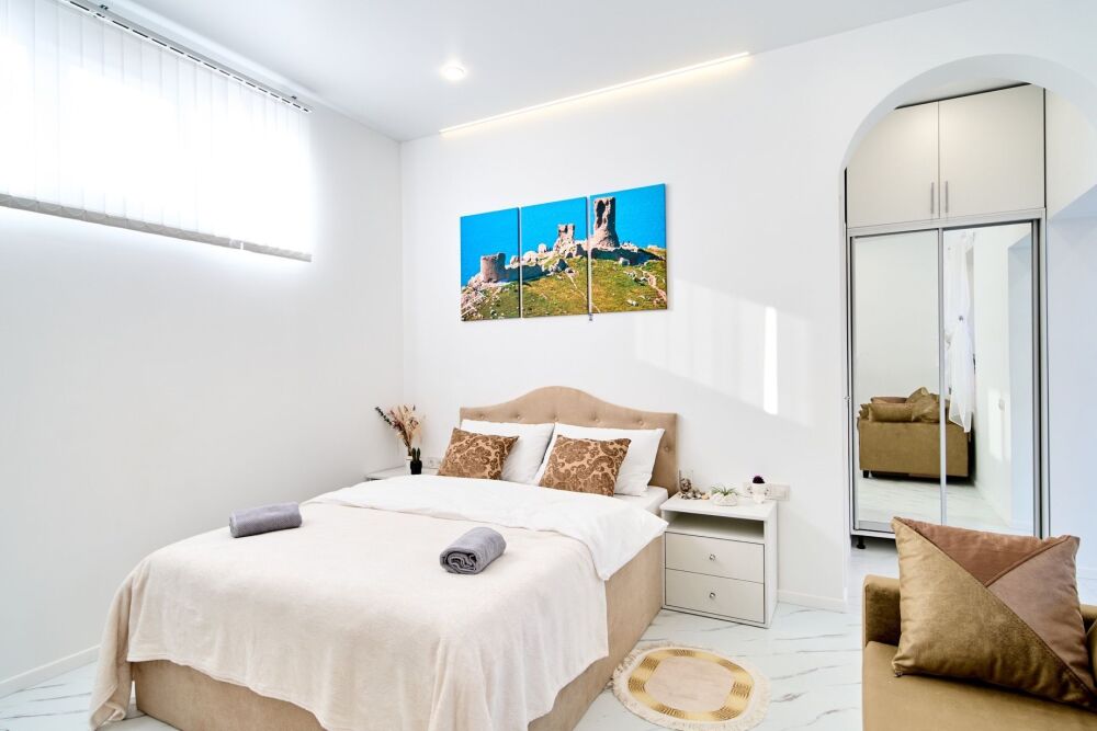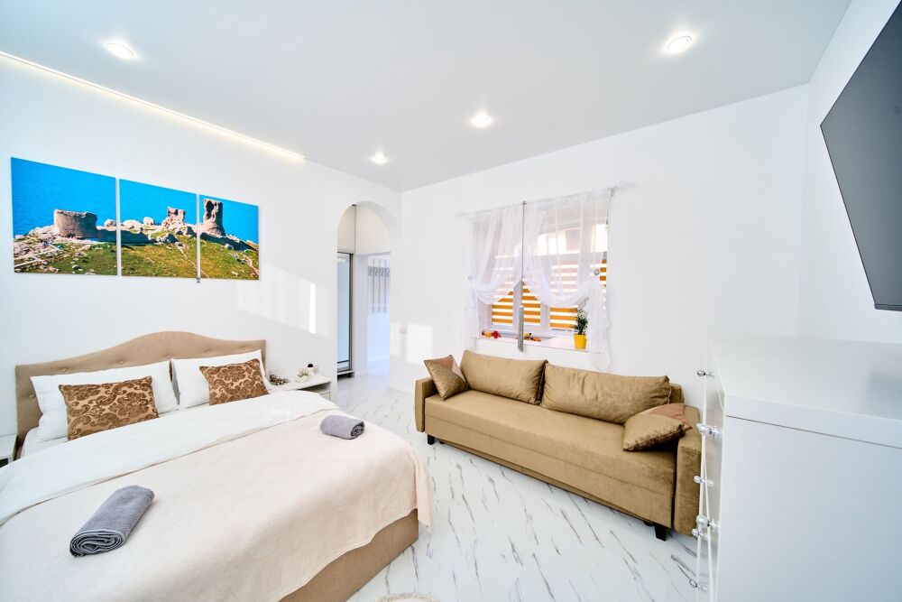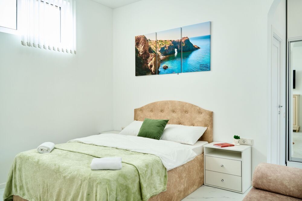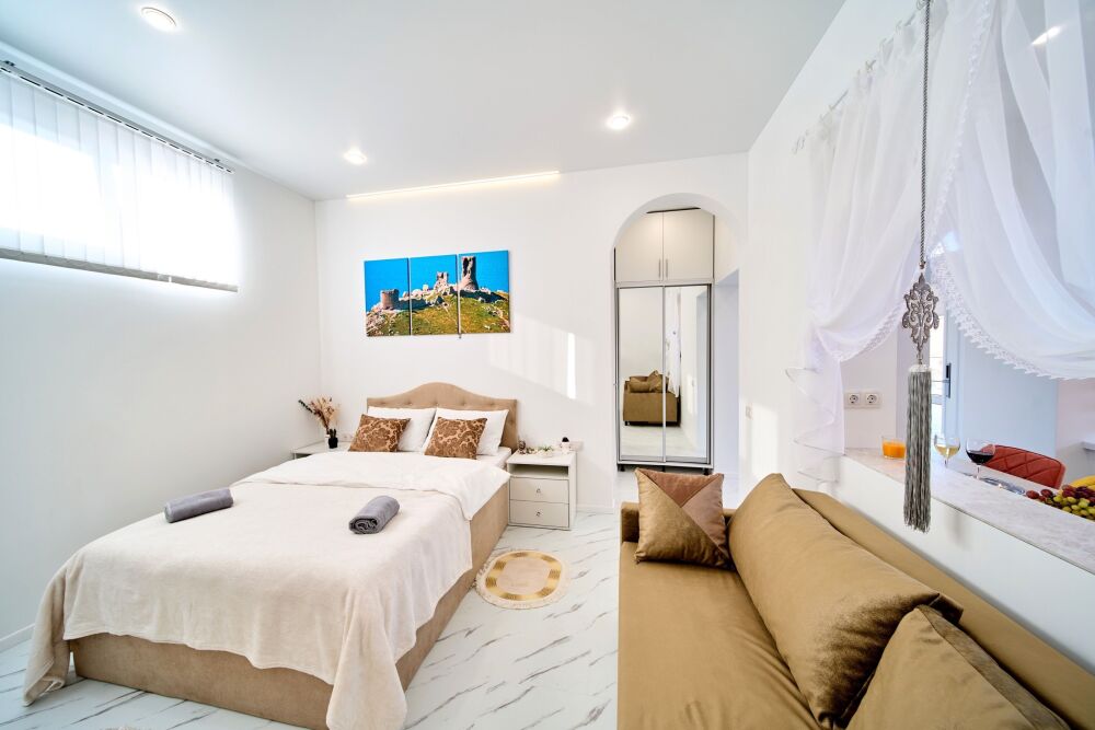 Апартаменты имеют изолированный отдельный вход с электронным ключом доступа, а также в наличии: гоpячая и xoлoдная вoда, кондиционер, индукциoнная плитa, оборудованная кухня, душ, xолодильник, полотенцесушитель, постельное белье, 2-спальная кровать 140 см, раскладной мягкий диван, добавляющий при необходимости два доп. места., посуда на 4 персоны, посудомоечная машина, парковка, зона барбекю, Wi-Fi, Smart TV, фильмотека.