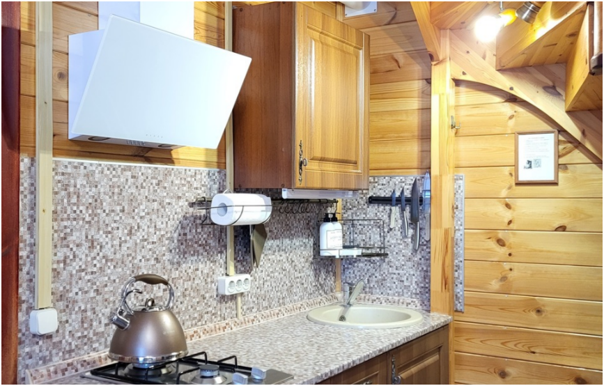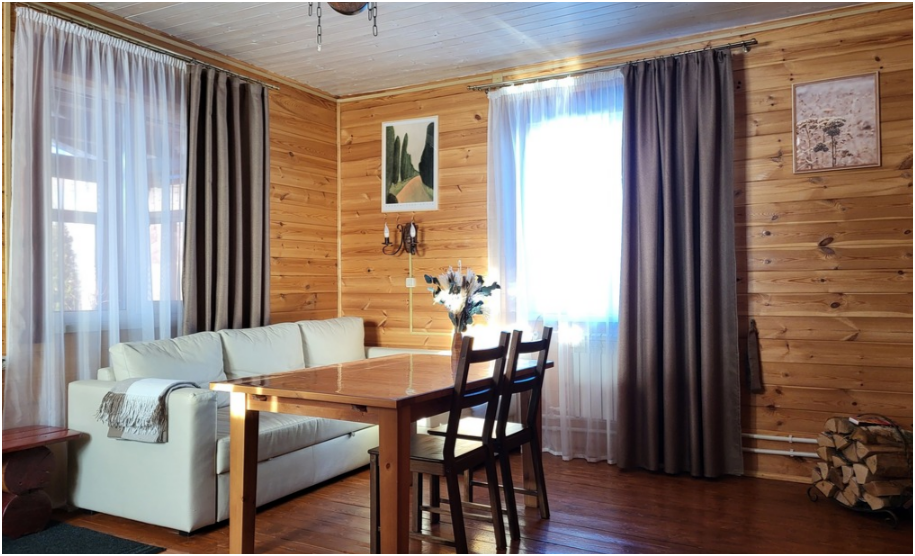 На первом этаже находится кухня-гостиная, сауна, душевая и санузел. Диван раскладывается в двуспальное место.