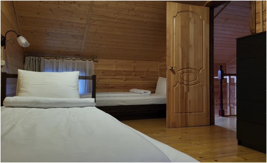 На втором этаже 2 спальни с двуспальной кроватью и тремя односпальными. По предварительному запросу для детей до 3-х лет бесплатно предоставляем детскую кроватку-манеж.
