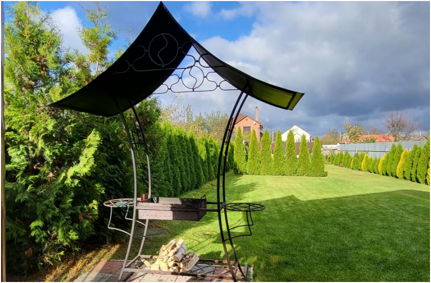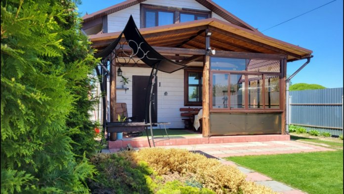 Коттедж №2 двухэтажный, имеет собственную парковку на 3 авто, застекленную террасу с мебелью, мангальную зону и большую лужайку перед домом.