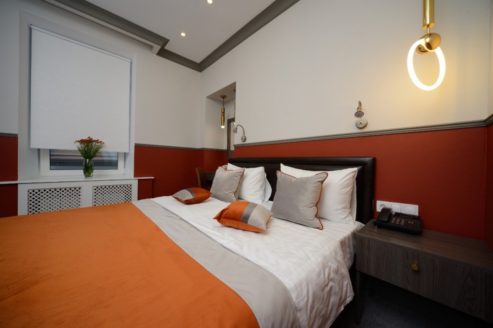 Номер в красных тонах площадью 15м² и кроватью king size в самом центре Москвы. В номере есть кондиционер, чайник, холодильник с мини баром, ванные принадлежности и тапочки. Специально для наших гостей в зоне мини кафе есть чай, кофе и вода. Стойка ресепшена работает круглосуточно.