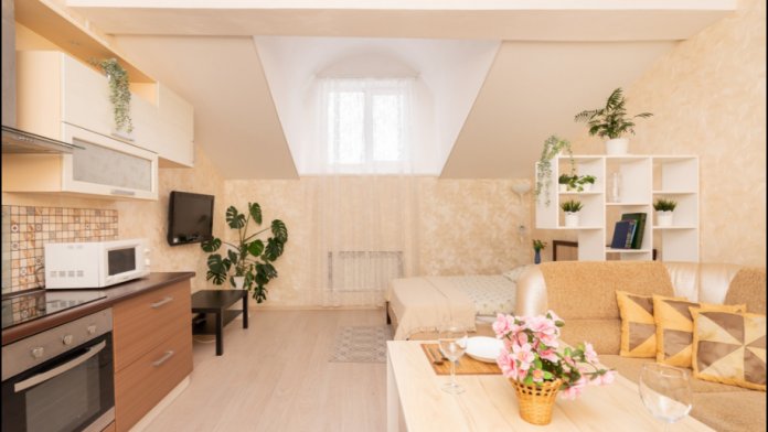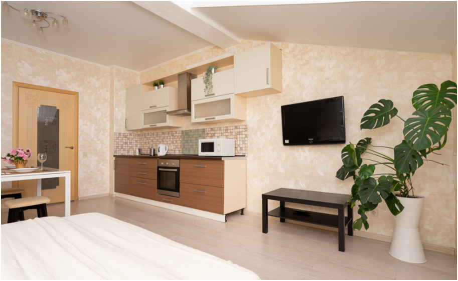 В квартире-студии площадью 45 квадратных метра проведён современный ремонт и интерьер жилья подобран в модном скандинавском стиле. Для наших гостей доступна двуспальная кровать-ниша 200x140 см с мягким и комфортным матрасом, диван-кровать шириной 160 см, ЖК телевизор с кабельным телевиденьем, высоко скоростной интернет с доступом Wi-Fi, раздельный санузел с ванной и стиральной машиной, комплект полотенец, шампунь, гель для душа.