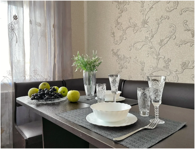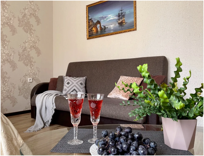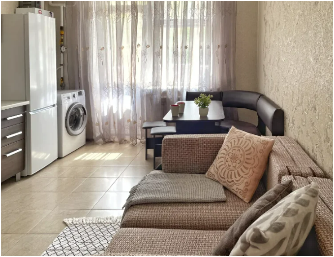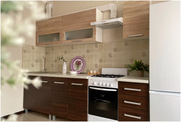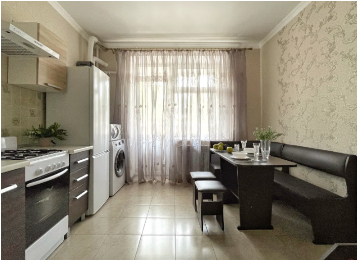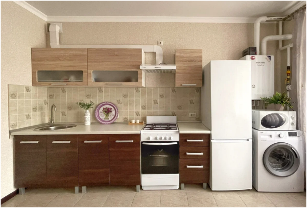 - полноценная кухня с варочной поверхностью, холодильником, СВЧ-печью, электрочайником и всей необходимой посудой и и столовыми приборами.