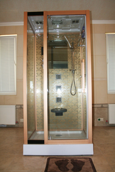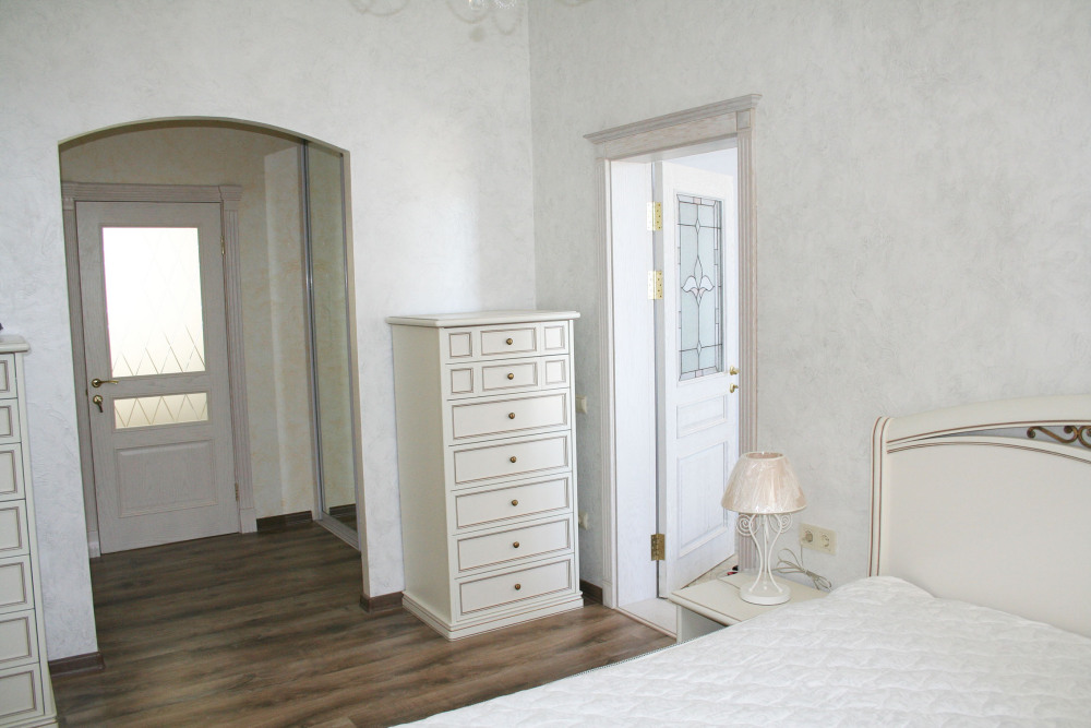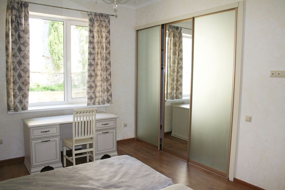 Новый просторный дом, построенный по индивидуальному проекту. В доме три этажа. На первом этаже: сауна с маленьким бассейном, туалет, душевая, прихожая и одна комната. На втором этаже: две спальни, одна с с двуспальной кроватью и видом на море, вторая с двумя односпальными кроватями, большой холл с обеденным столом, кухня и санузел. На третьем этаже: три спальни - одна с двуспальной кроватью и дополнительной комнатой-кабинетом и видом на море, вторая с двуспальной кроватью и видом на море, третья с двумя односпальными кроватями, санузел.
