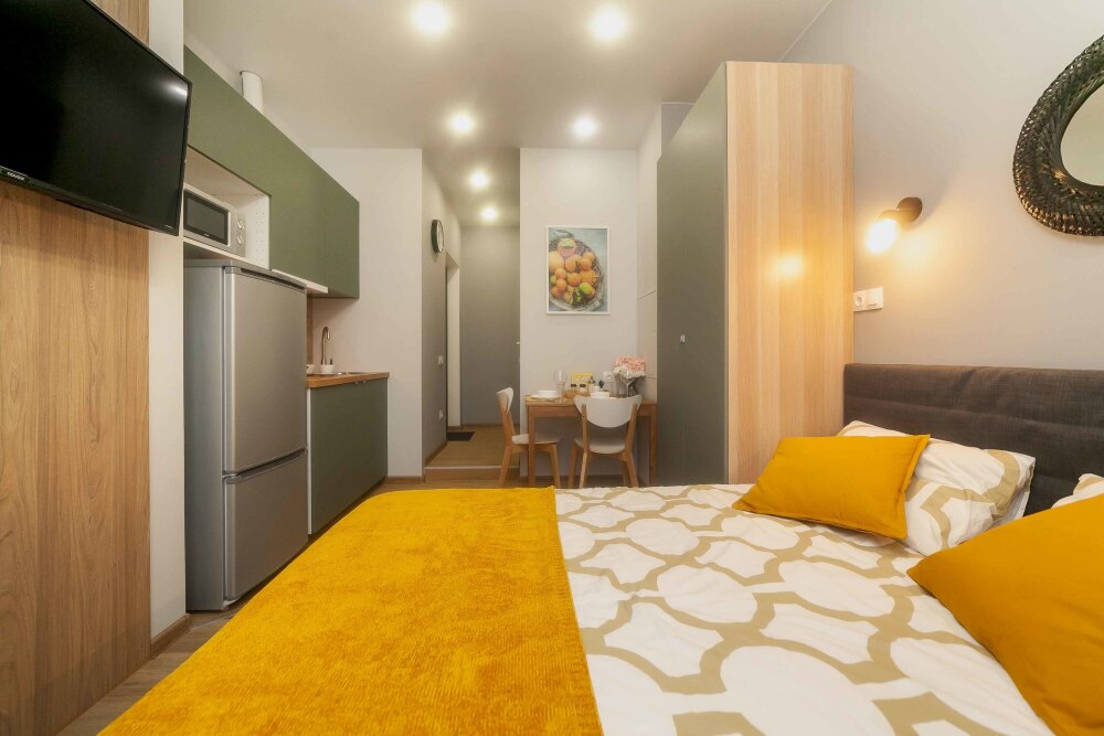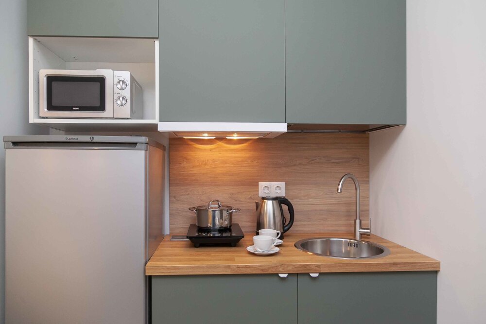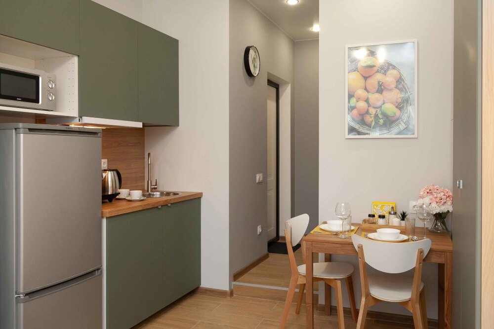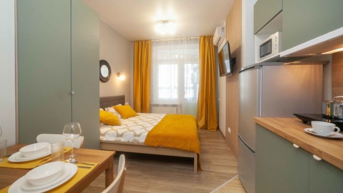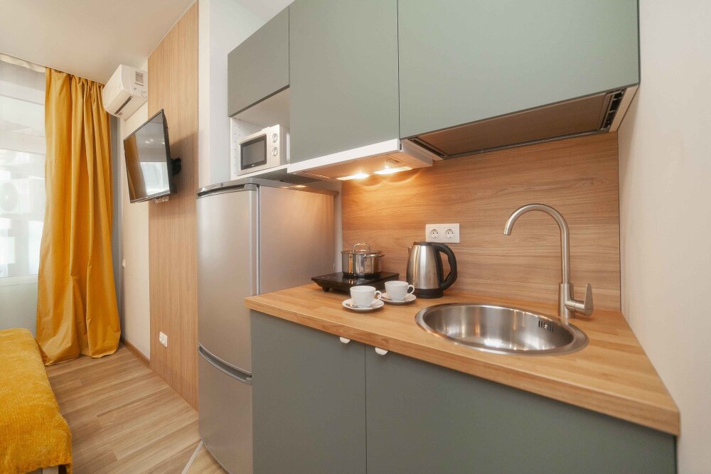 Оснащение: телевизор, кухонная зона , холодильник, электрический чайник, стиральная машина, кондиционер, электрическая плита, фен