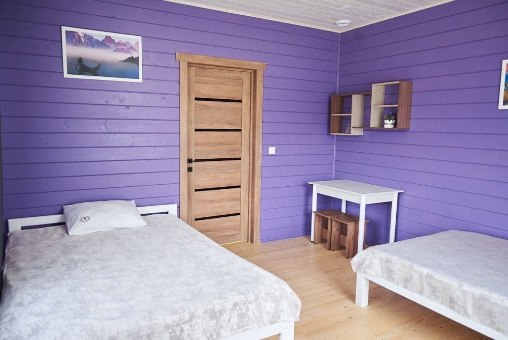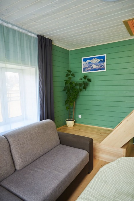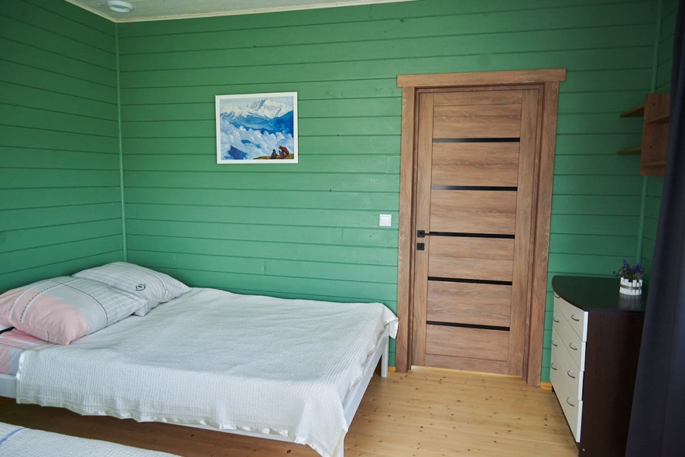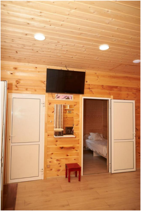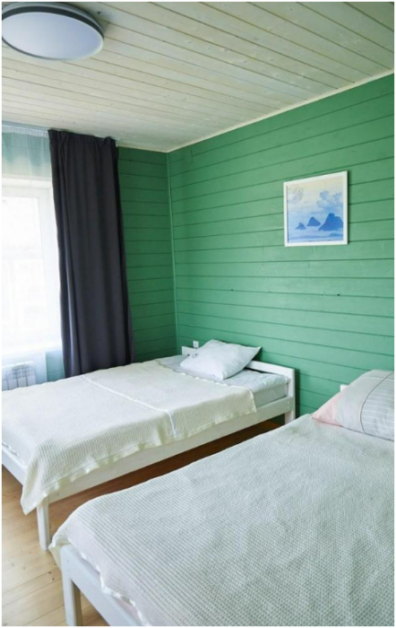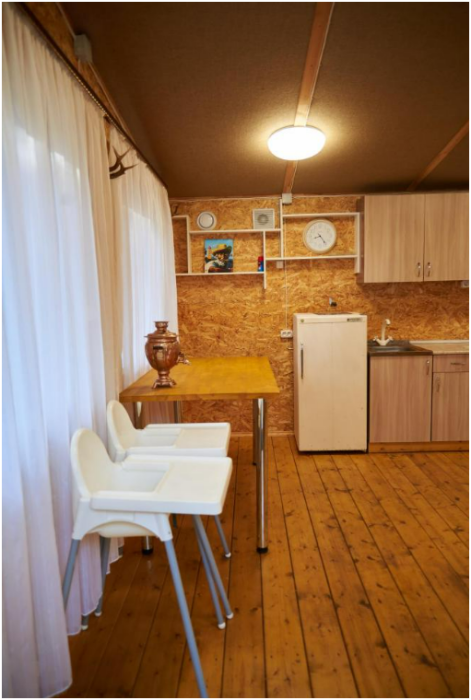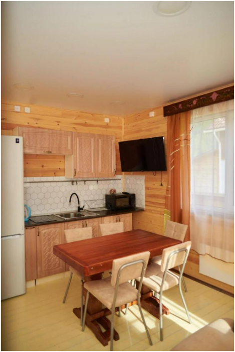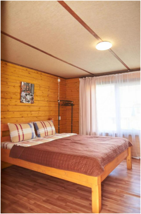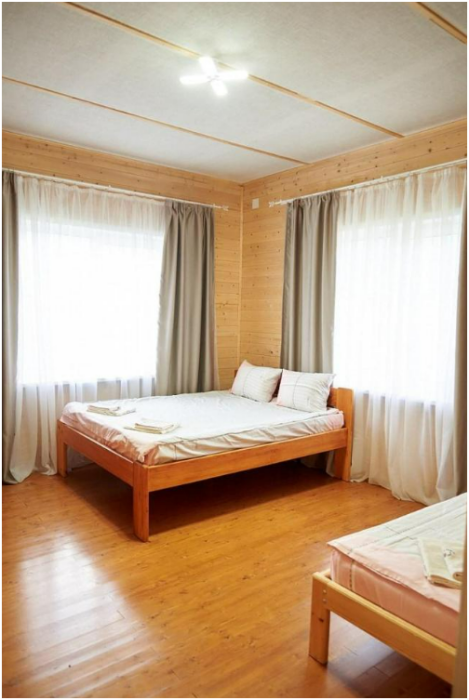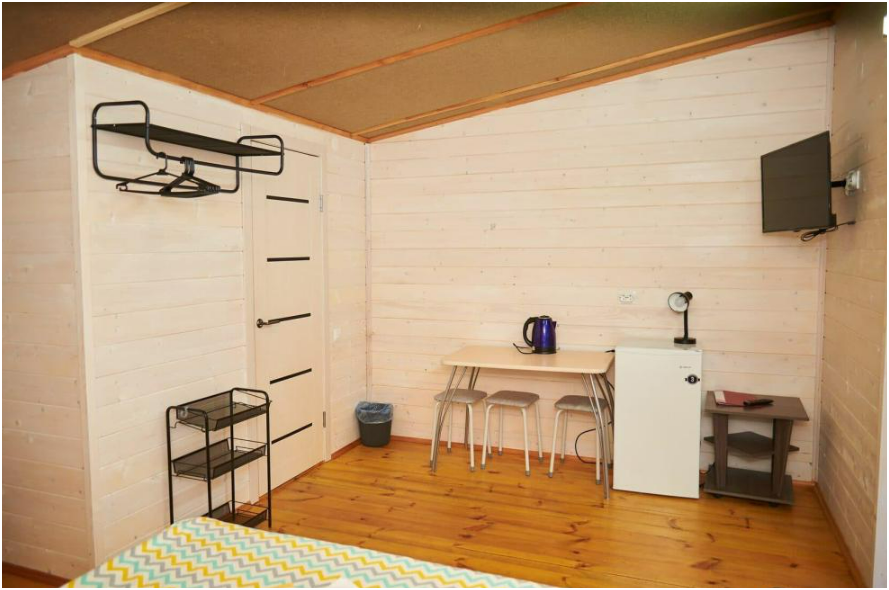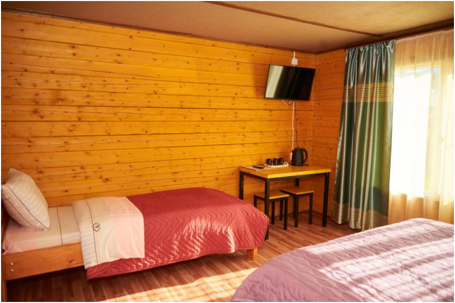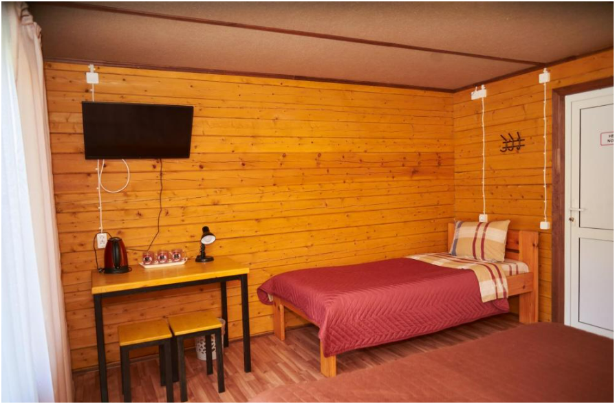 В номере установлены большая двуспальная кровать размером 160×200 см и односпальная кровать размером 110×200 см. Для удобства гостей предусмотрены ЖК-телевизор, холодильник, обеденный стол с посудой, включая чайные кружки, большое блюдо, тарелки под второе блюдо, электрический чайник и настольная лампа. Также предоставляются постельное белье и комплект полотенец. В собственной ванной комнате есть душ, унитаз, раковина, зеркало, бойлер, туалетные принадлежности и одноразовые предметы личной гигиены.