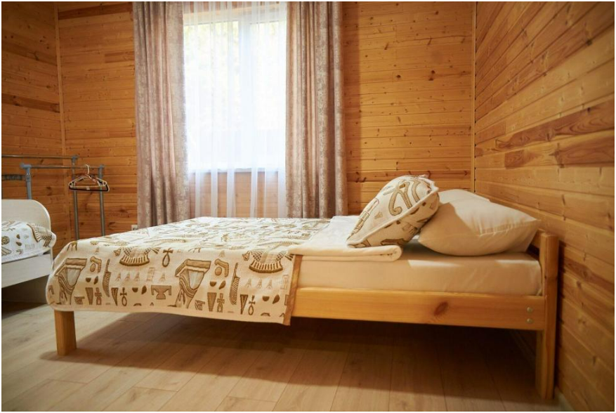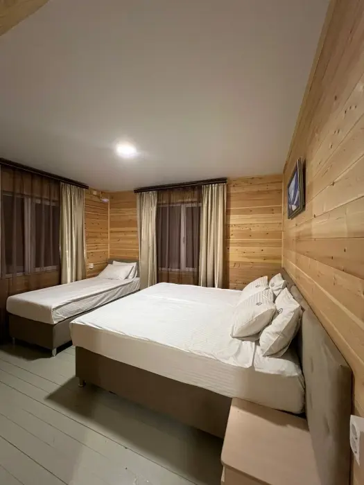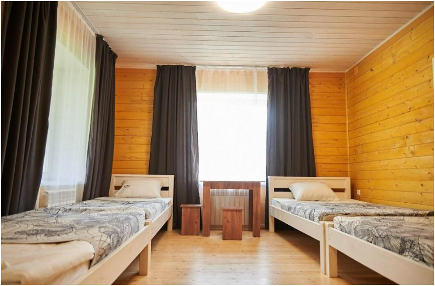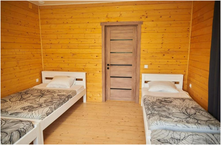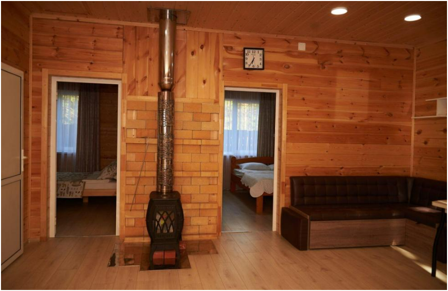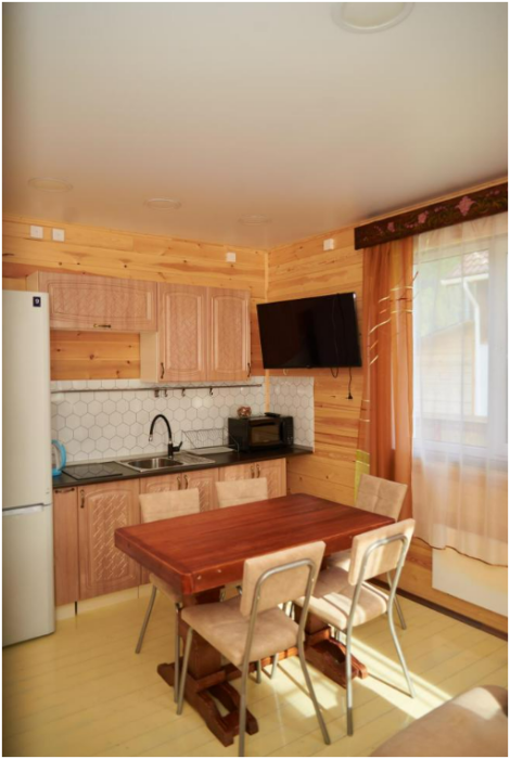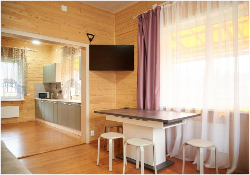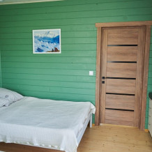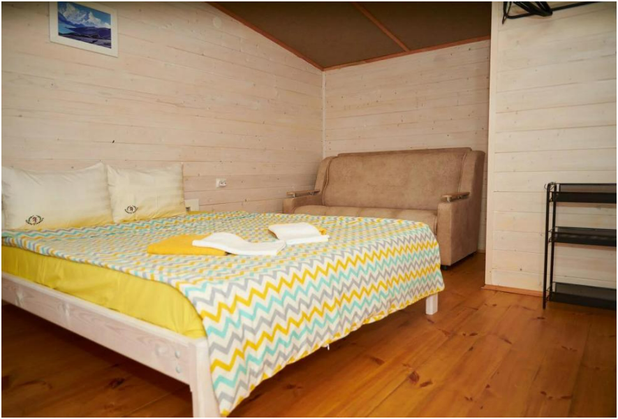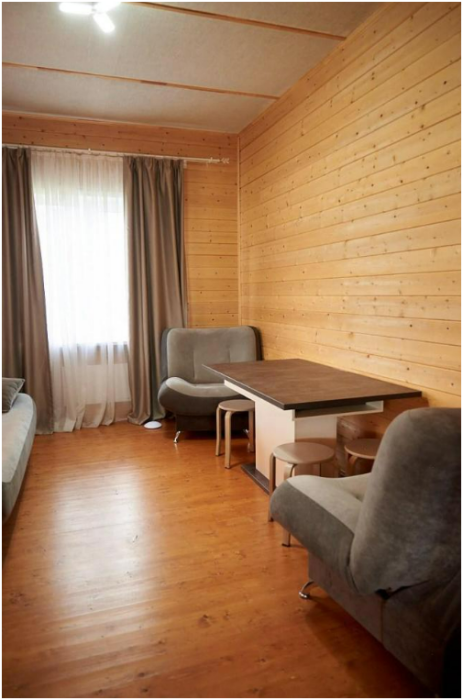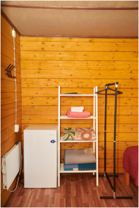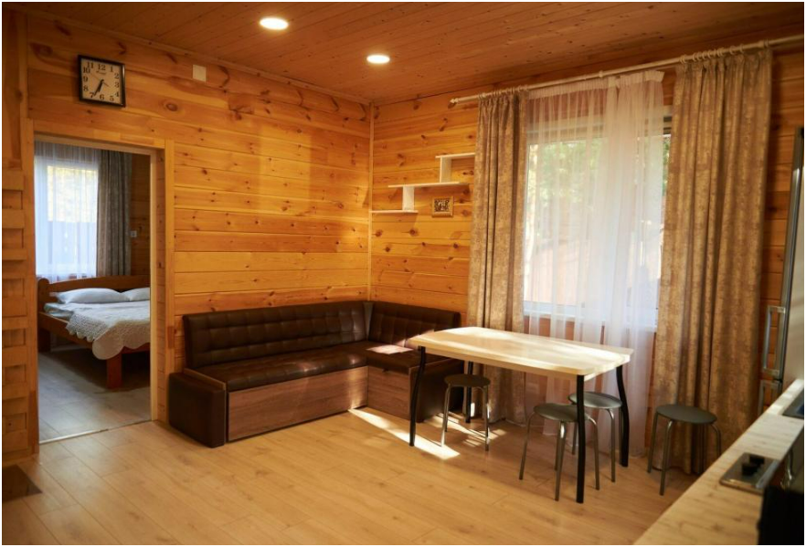 В номере установлены большая двуспальная кровать размером 160×200 см и односпальная кровать размером 110×200 см. Для удобства гостей предусмотрены ЖК-телевизор, холодильник, обеденный стол с посудой, включая чайные кружки, большое блюдо, тарелки под второе блюдо, электрический чайник и настольная лампа. Также предоставляются постельное белье и комплект полотенец. В собственной ванной комнате есть душ, унитаз, раковина, зеркало, бойлер, туалетные принадлежности и одноразовые предметы личной гигиены.