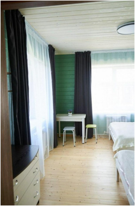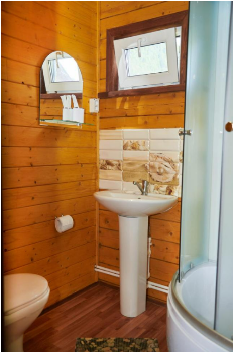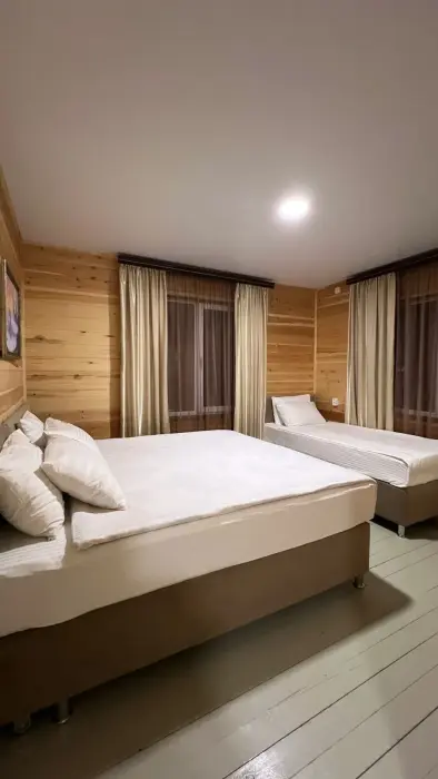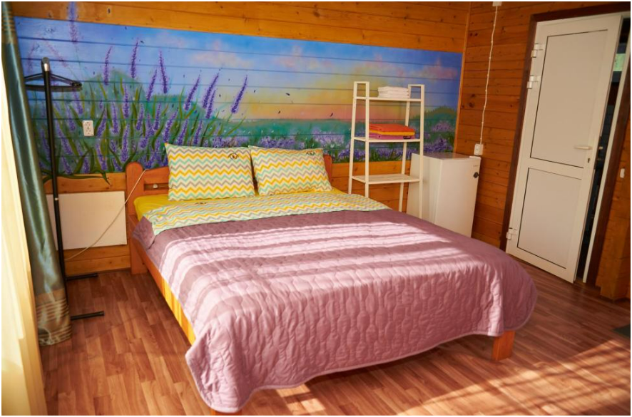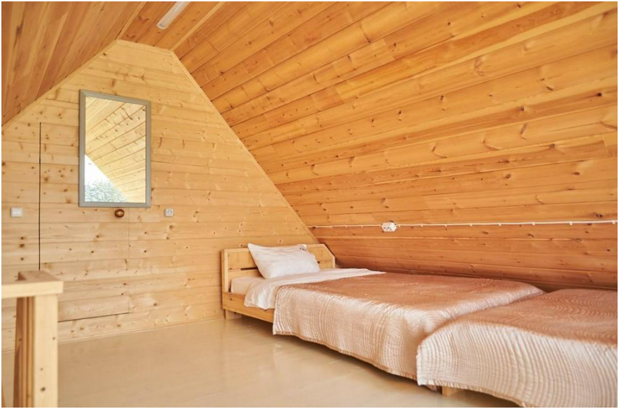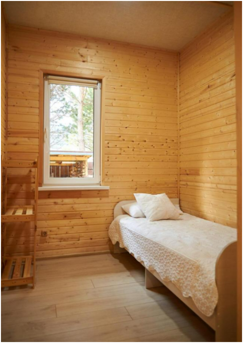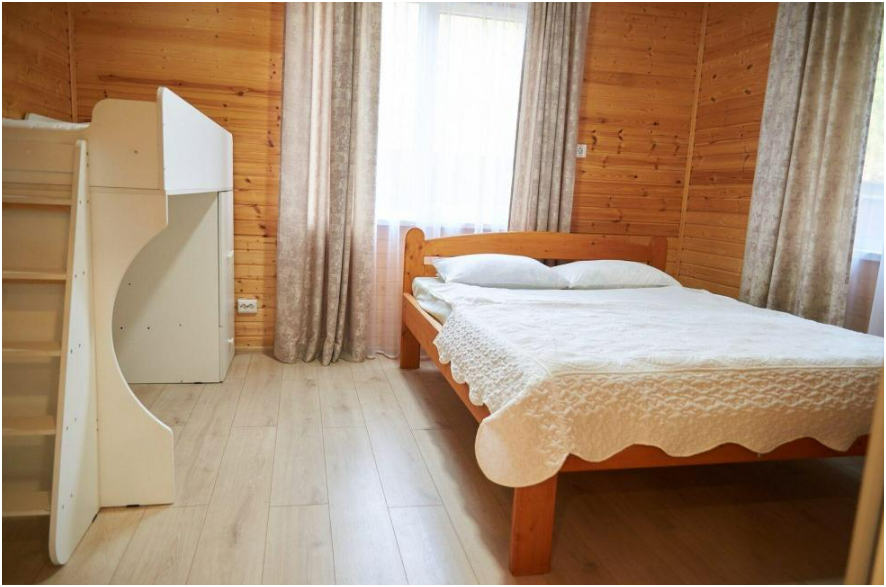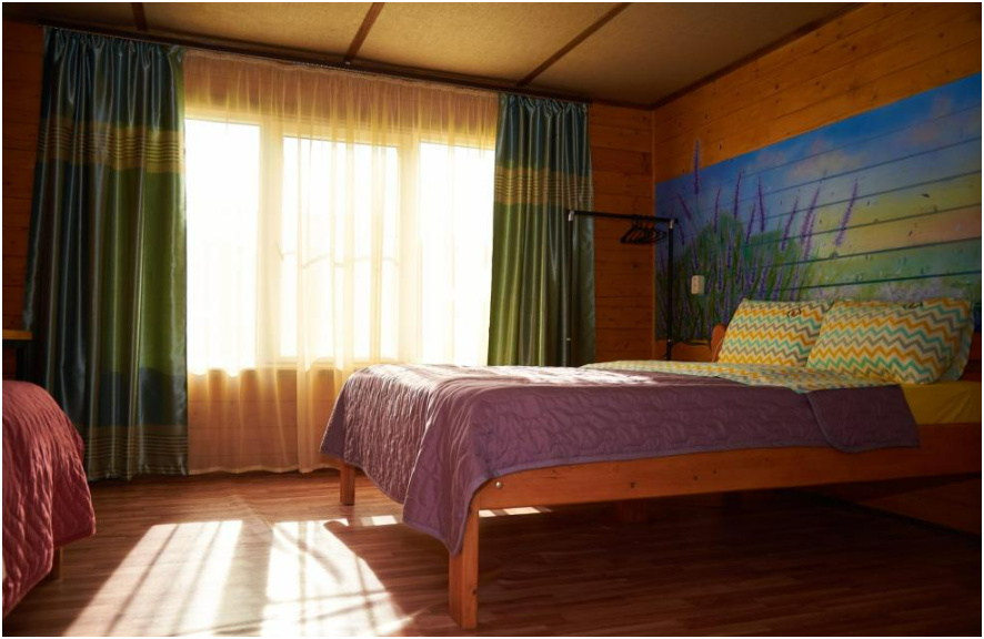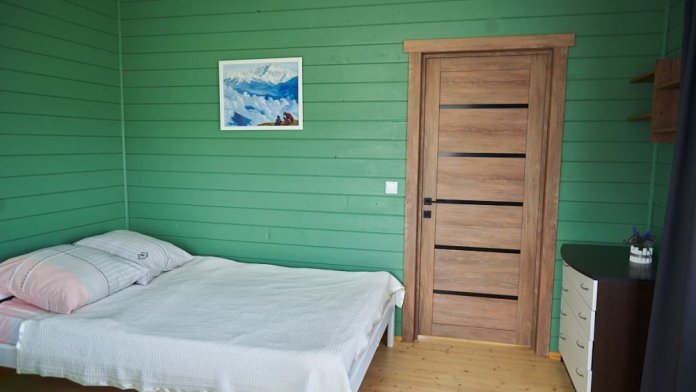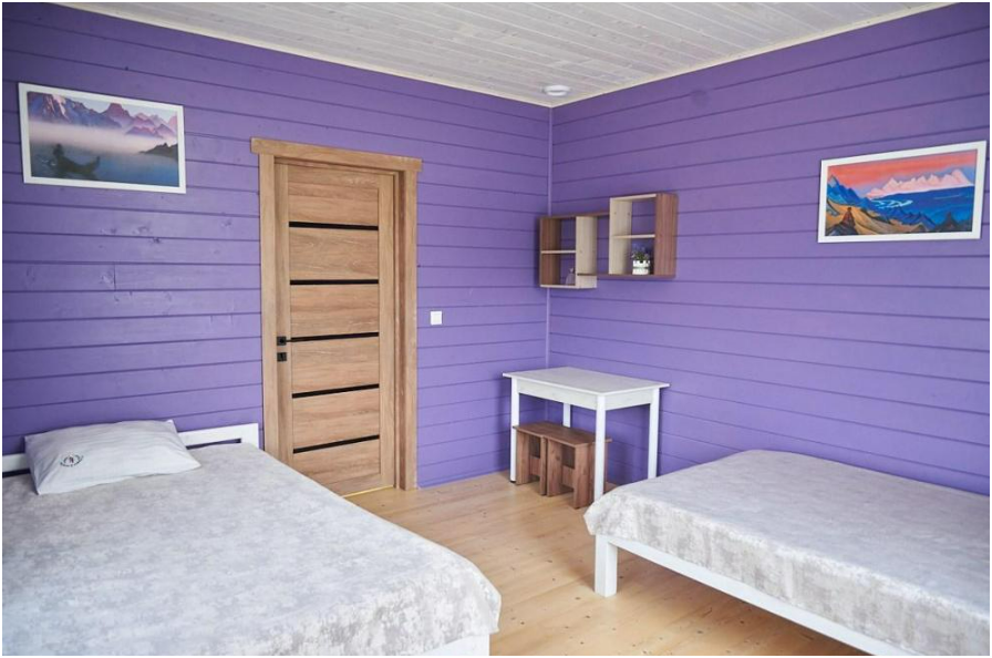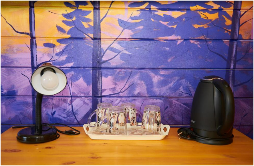В номере установлены большая двуспальная кровать размером 160×200 см и односпальная кровать размером 110×200 см. Для удобства гостей предусмотрены ЖК-телевизор, холодильник, обеденный стол с посудой, включая чайные кружки, большое блюдо, тарелки под второе блюдо, электрический чайник и настольная лампа. Также предоставляются постельное белье и комплект полотенец. В собственной ванной комнате есть душ, унитаз, раковина, зеркало, бойлер, туалетные принадлежности и одноразовые предметы личной гигиены.