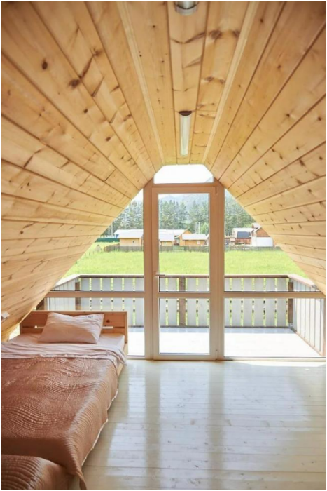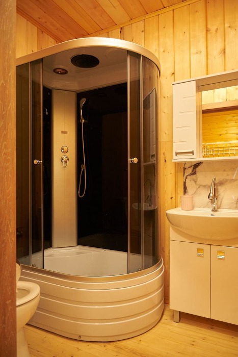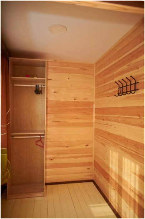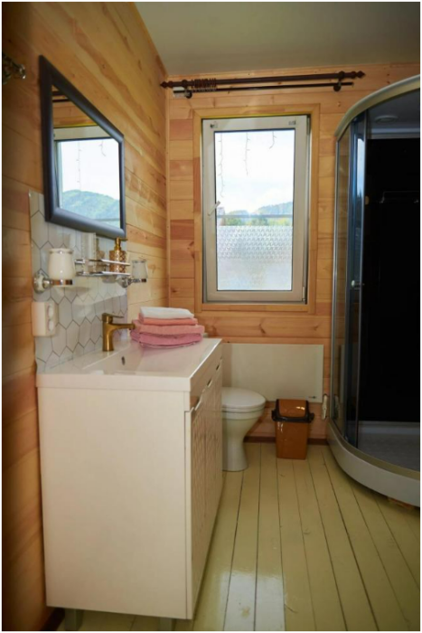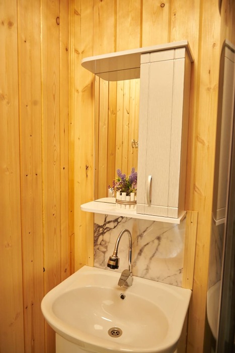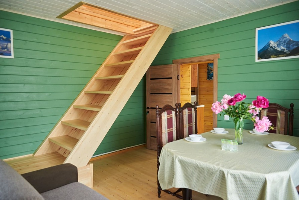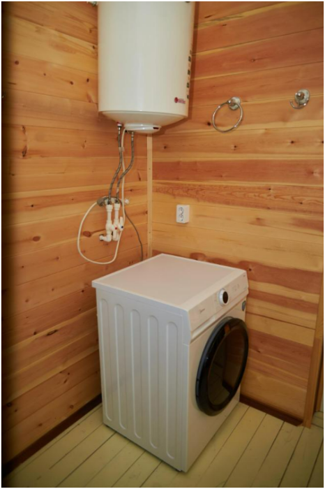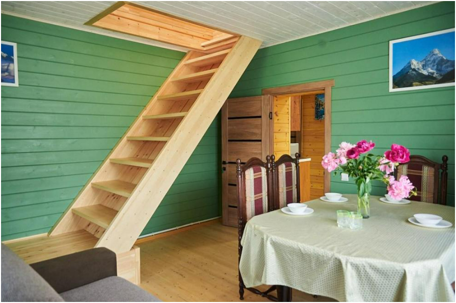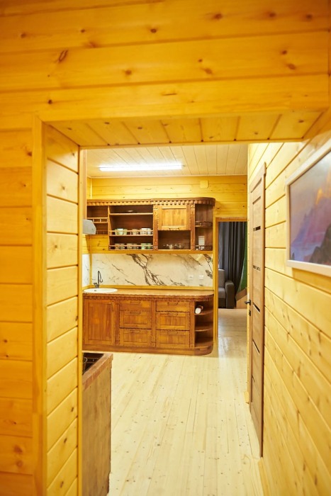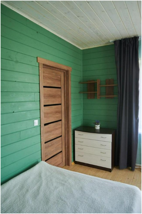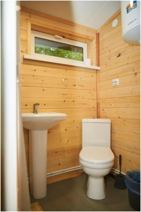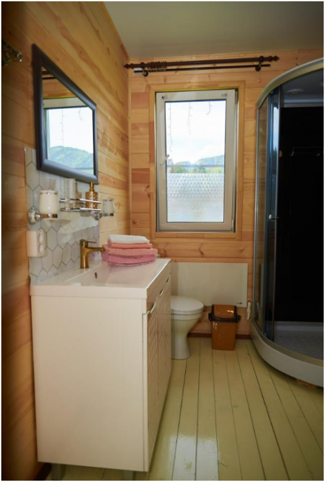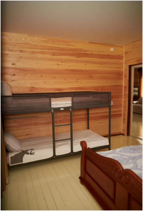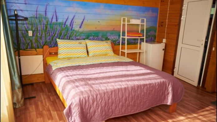 В номере установлены большая двуспальная кровать размером 160×200 см и односпальная кровать размером 110×200 см. Для удобства гостей предусмотрены ЖК-телевизор, холодильник, обеденный стол с посудой, включая чайные кружки, большое блюдо, тарелки под второе блюдо, электрический чайник и настольная лампа. Также предоставляются постельное белье и комплект полотенец. В собственной ванной комнате есть душ, унитаз, раковина, зеркало, бойлер, туалетные принадлежности и одноразовые предметы личной гигиены.
