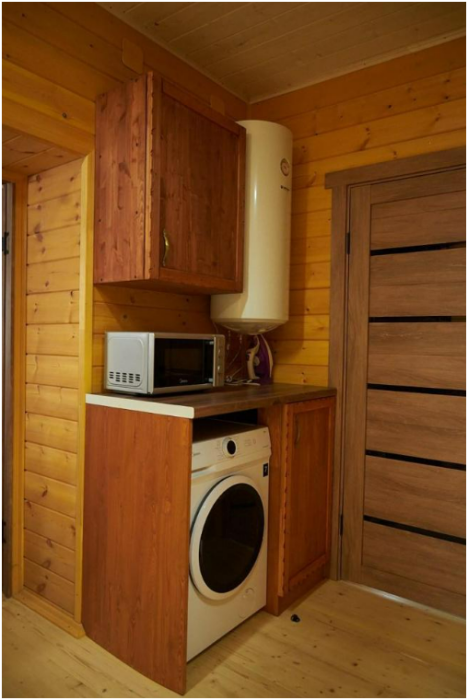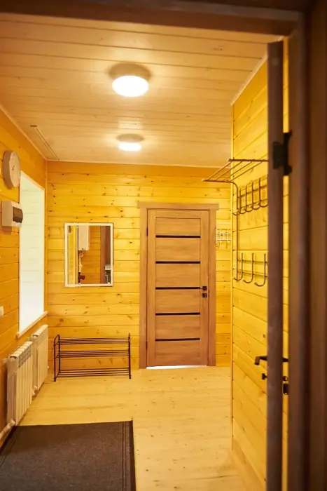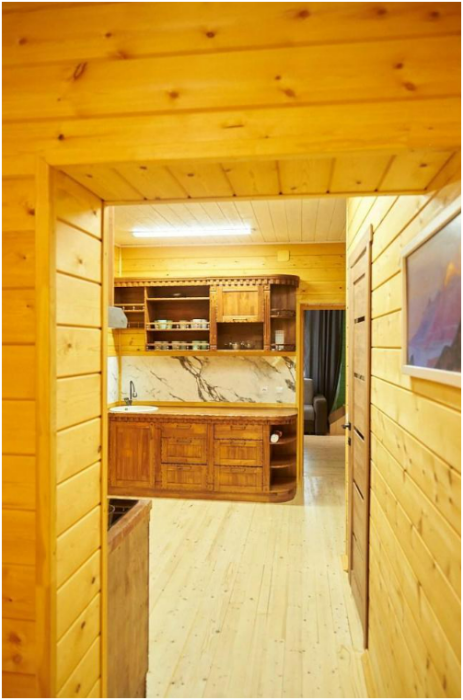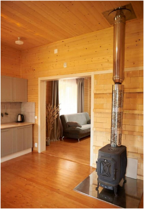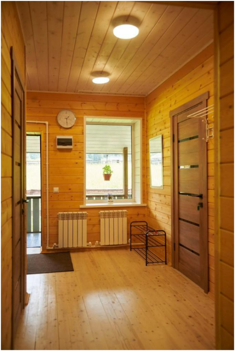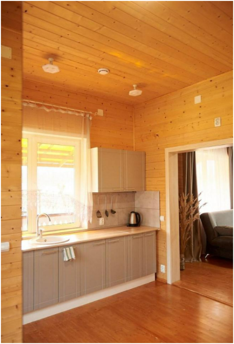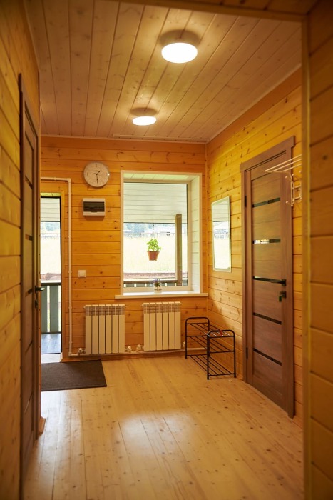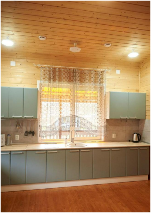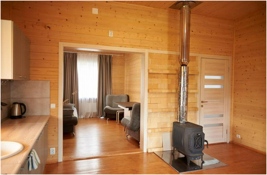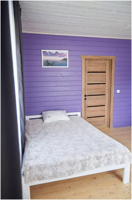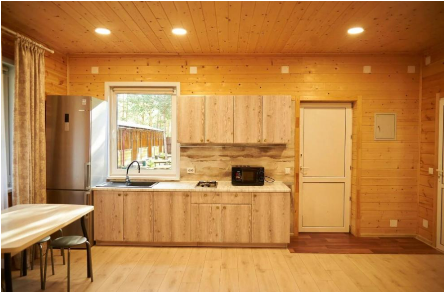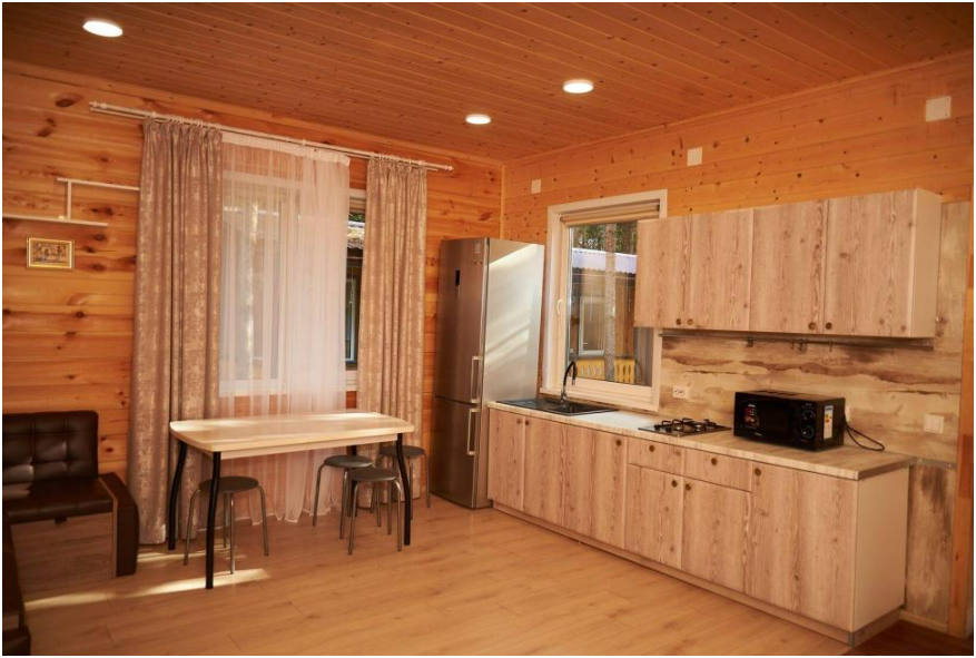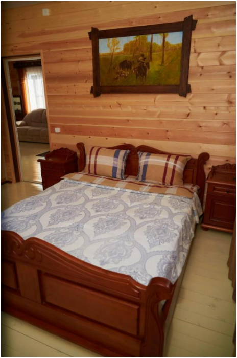 В спальне №1 есть 2 двуспальных кровати, большое кресло и шкаф платяной. В спальне №2 есть двуспальная кровать и одноярусная кровать. Кухня-студия оборудована всем необходимым для приготовления блюд. В гостиной есть большой стол для обедов. В доме есть вся необходимая посуда, столовые приборы, бокалы и чайные церемонии. Есть ЖК-телевизор, холодильник, электрический чайник, настольная лампа, постельное белье и комплект полотенец. Большая ванная комната с душем, туалетом, раковиной, зеркалом, бойлером, туалетными принадлежностями и одноразовыми предметами личной гигиены.