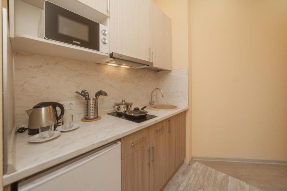 Оснащение: телевизор, кухонная зона, холодильник, электрический чайник, микроволновая печь, электрическая плита, фен.