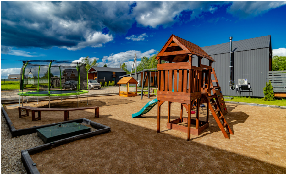 - Детская площадка со шведской стенкой, рукоходом, балконом, качелями, скалодромом и горкой;