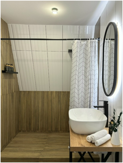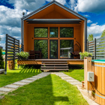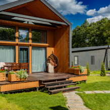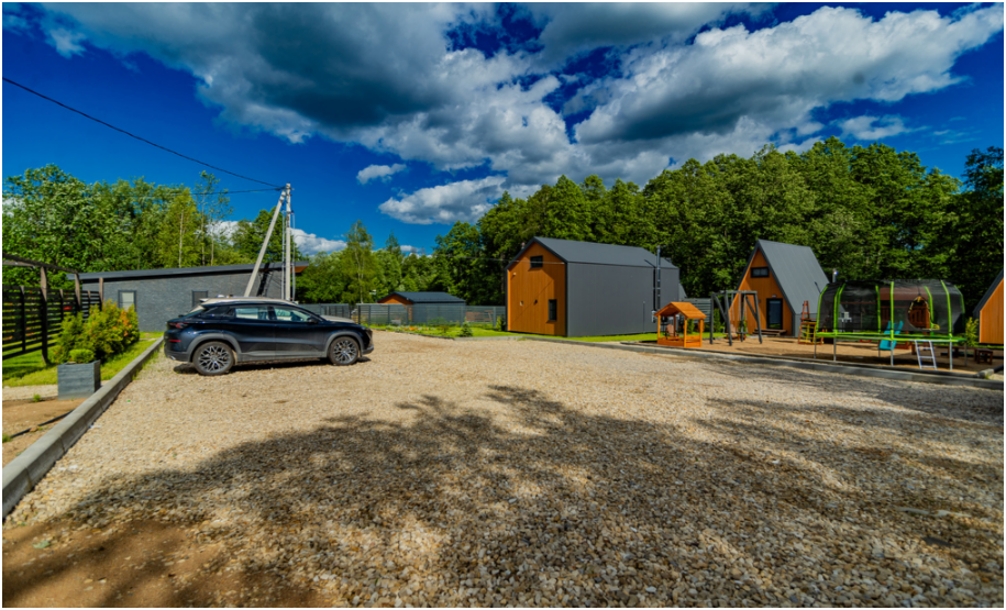 Вокруг наших домиков лес, можно собирать грибы. От детской площадки можно пройти по деревянной дорожке по лесу, к небольшой речке и насладится ее журчанием сидя на террасе с лавочками. Парковка на 18 машиномест.