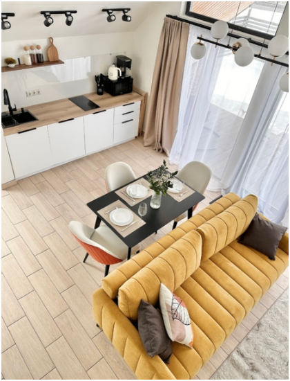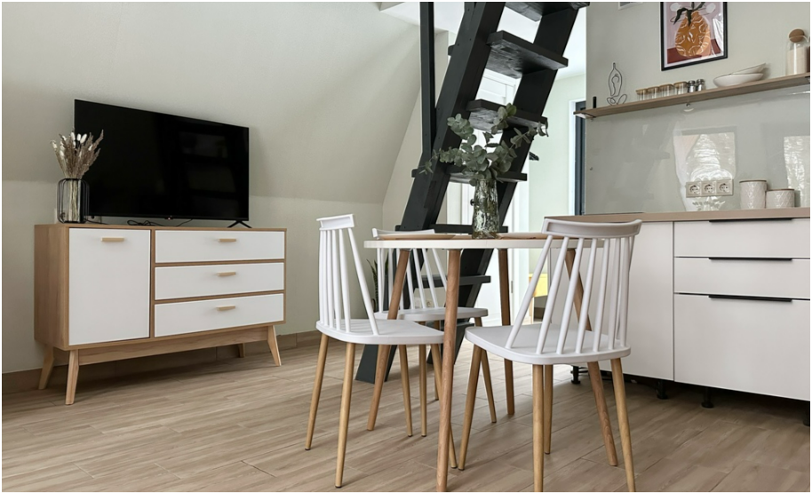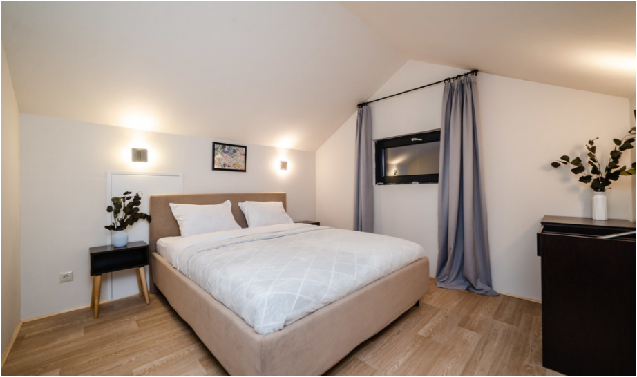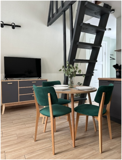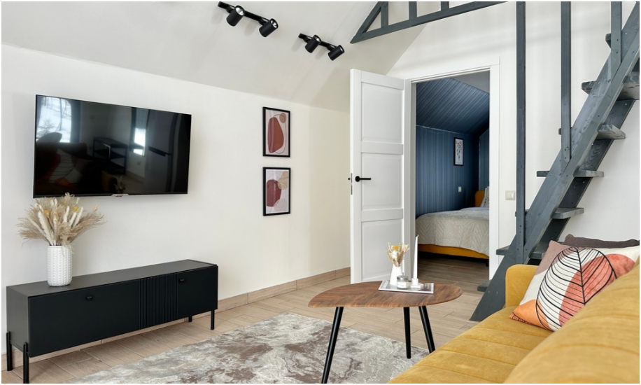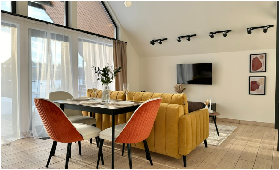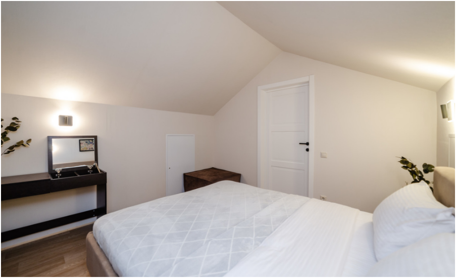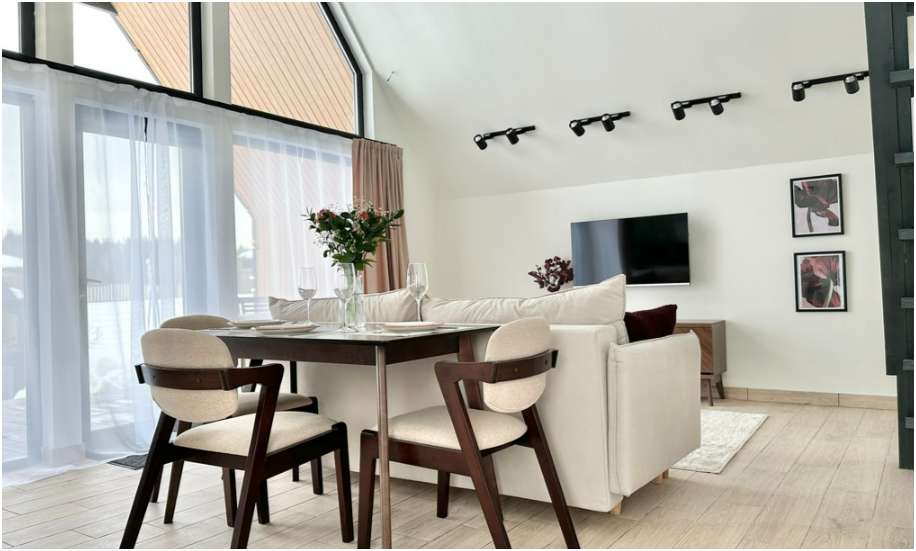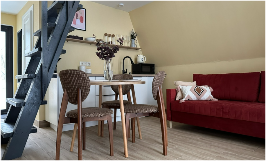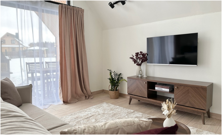 На первом этаже, просторная гостиная с диваном, телевизором, камином, кухонная зона оборудована современным кухонным гарнитуром и обеденным столом. В кухне есть: плита, холодильник с морозильником, посудомоечная машина, микроволновка, чайник, кофемашина. Так же на первом этаже есть санузел и современная ванная комната с душевой кабиной и баней на дровах. Спальня с двумя уютными односпальными кроватями. На втором этаже расположена вторая спальня с роскошной двуспальной кроватью.