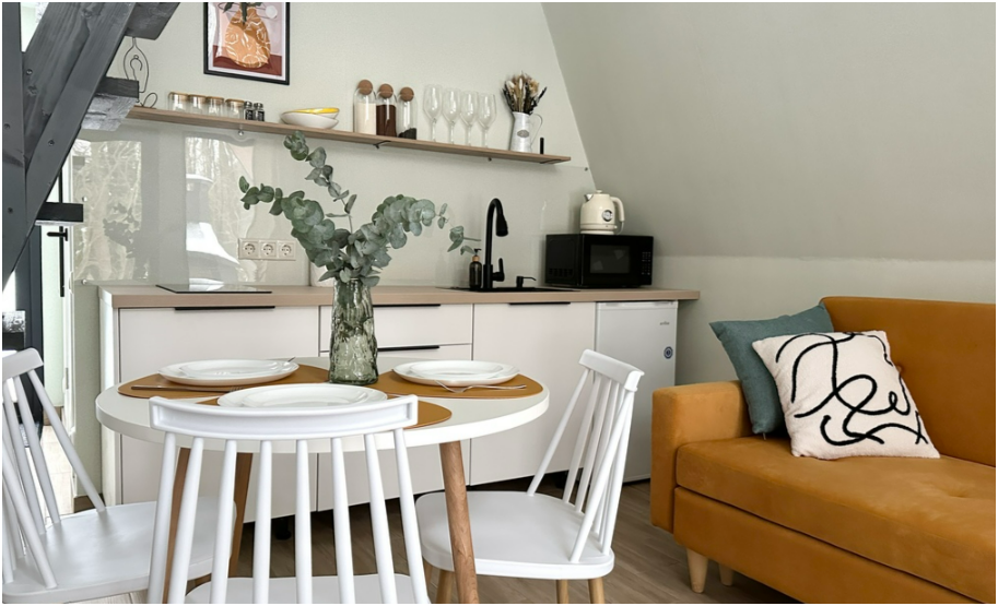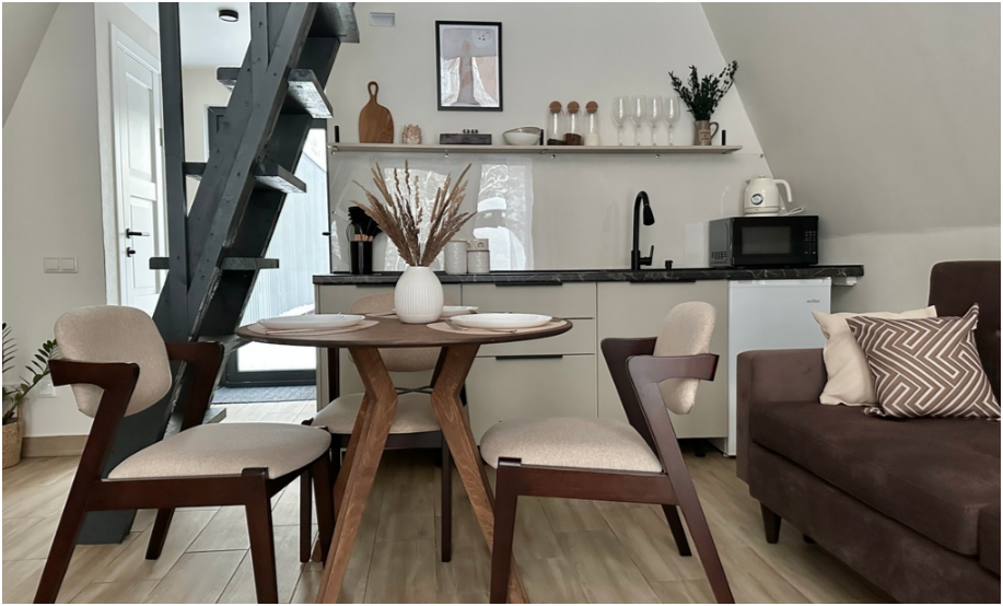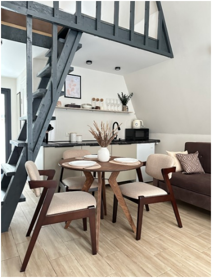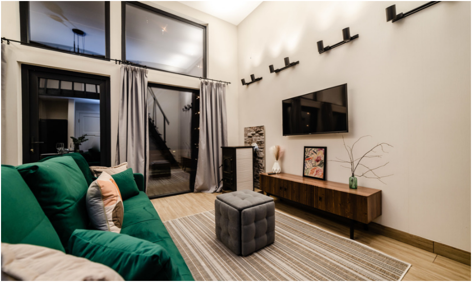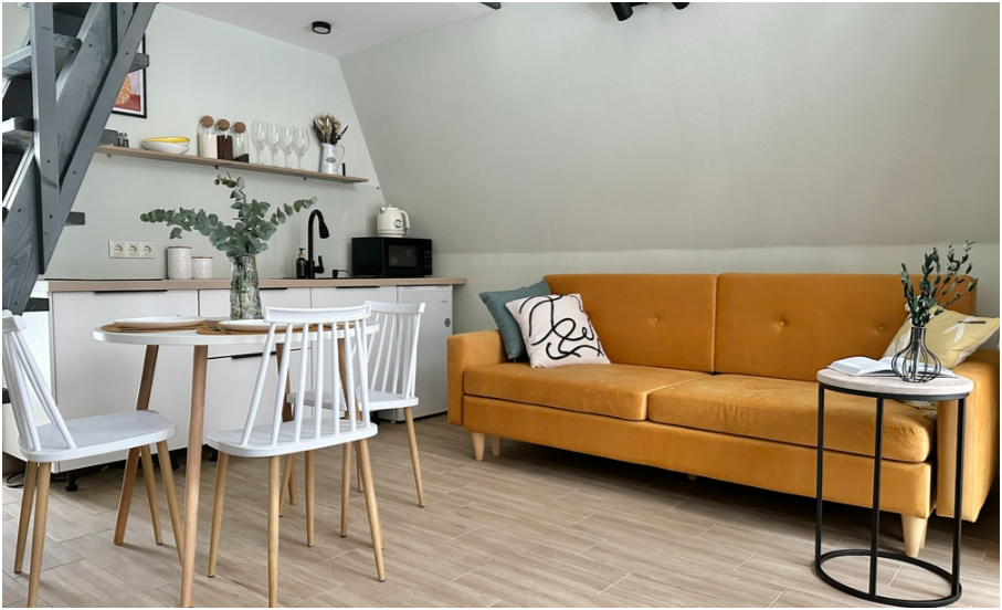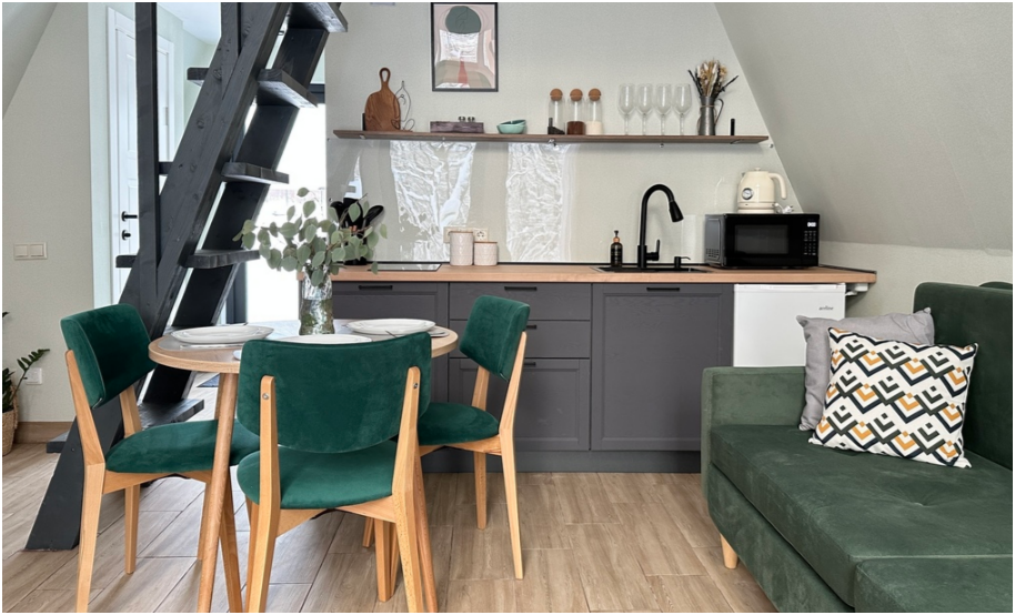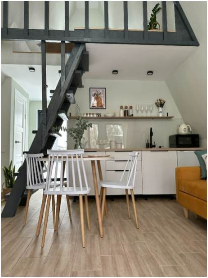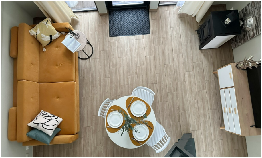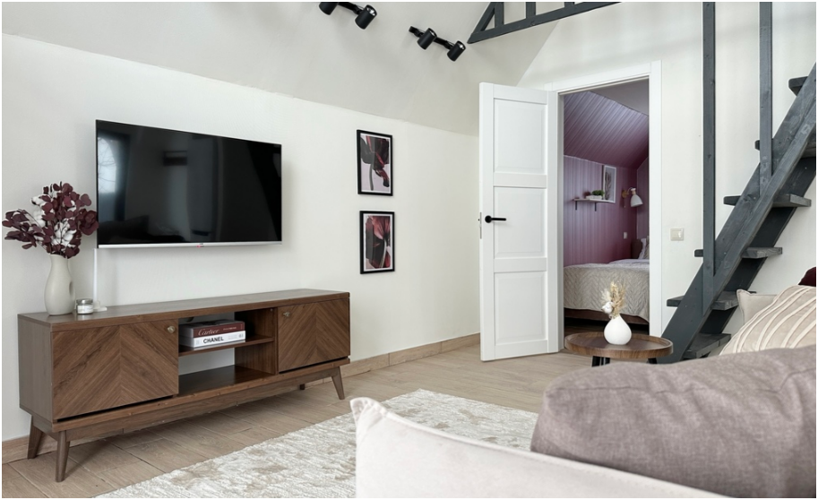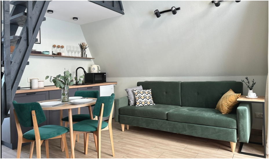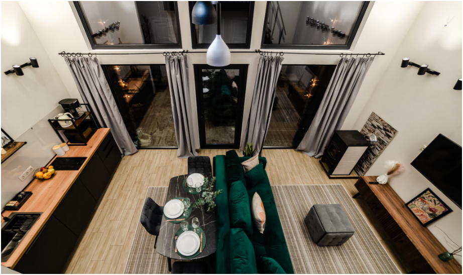 На первом этаже дома, просторная гостиная с диваном, телевизором, камином, кухонная зона оборудована современным кухонным гарнитуром и обеденным столом. В кухне есть: плита, холодильник с морозильником, микроволновка, чайник. Так же на первом этаже есть санузел с душевой кабиной. На втором этаже расположена роскошная двуспальная кровать.