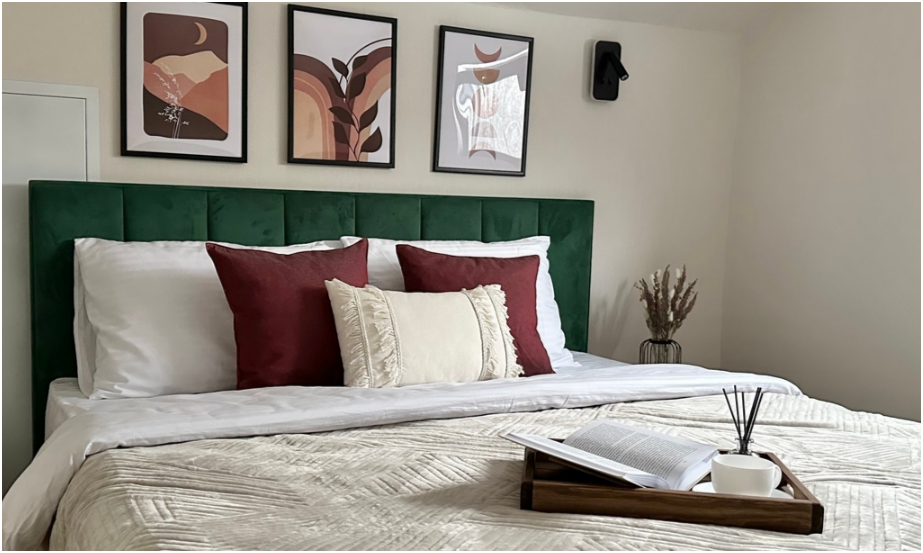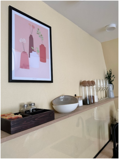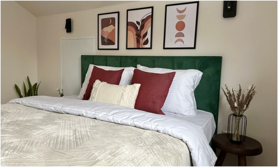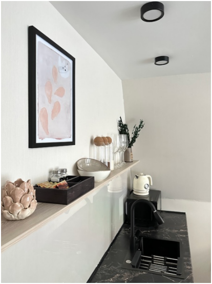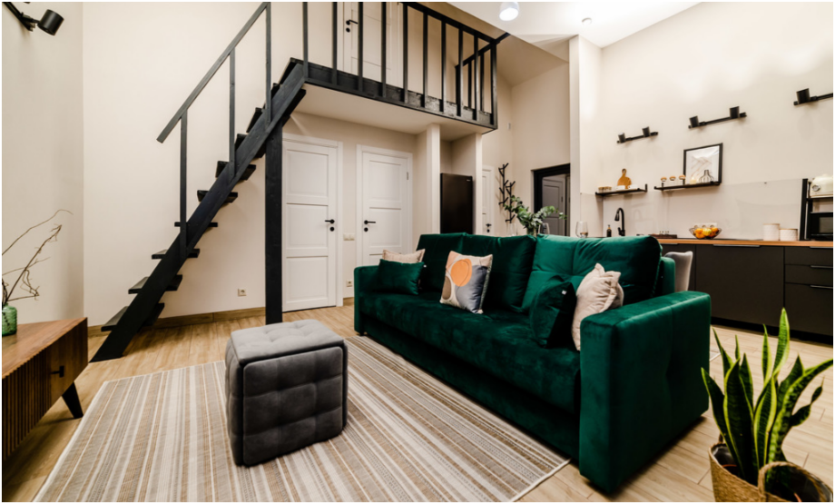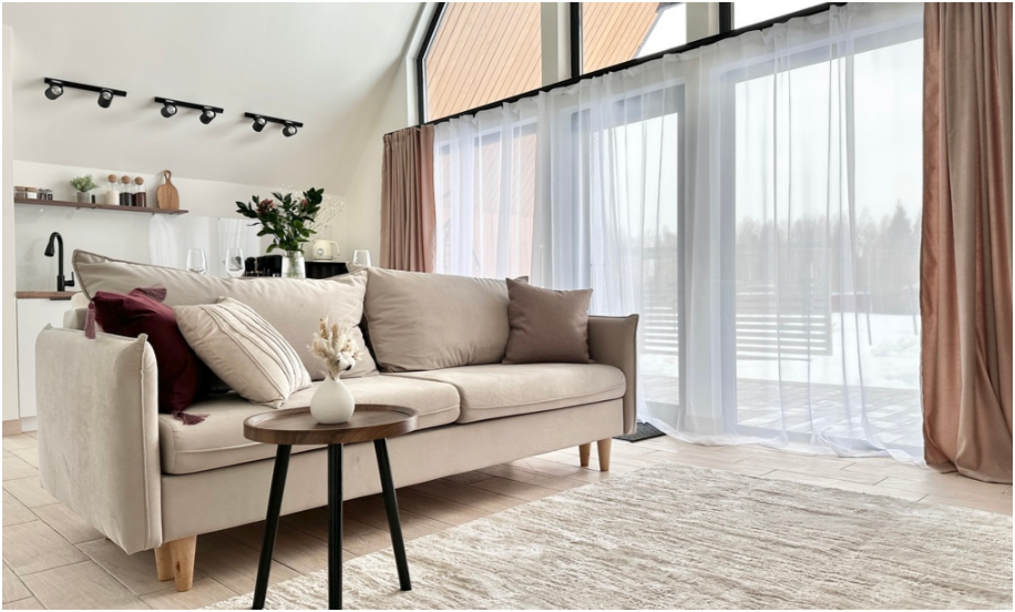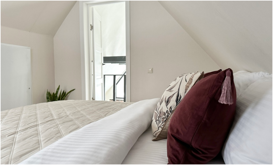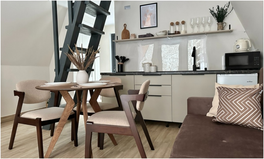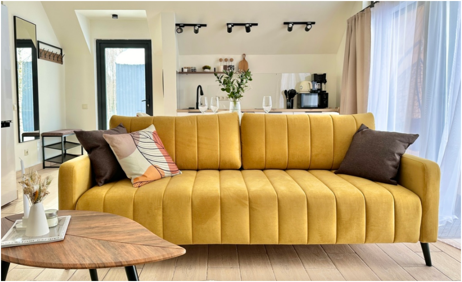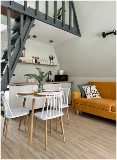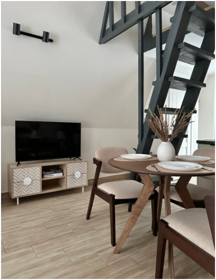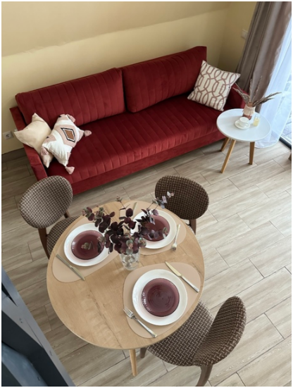 На первом этаже дома, просторная гостиная с диваном, телевизором, камином, кухонная зона оборудована современным кухонным гарнитуром и обеденным столом. В кухне есть: плита, холодильник с морозильником, микроволновка, чайник. Так же на первом этаже есть санузел с душевой кабиной. На втором этаже расположена роскошная двуспальная кровать.