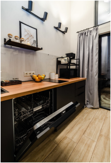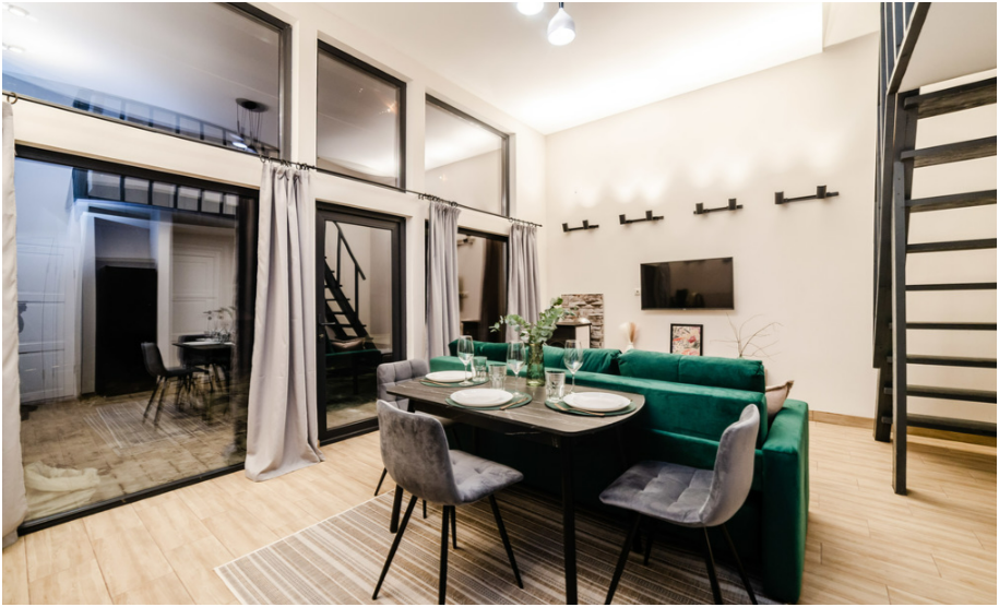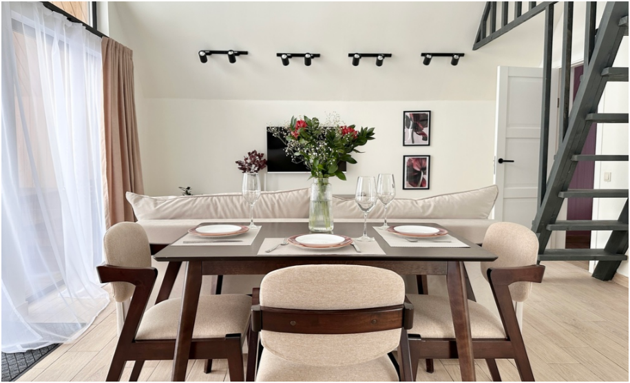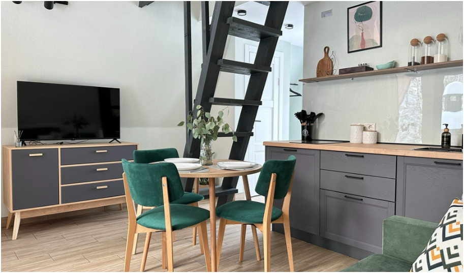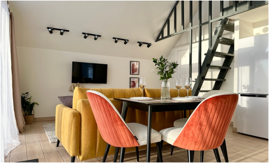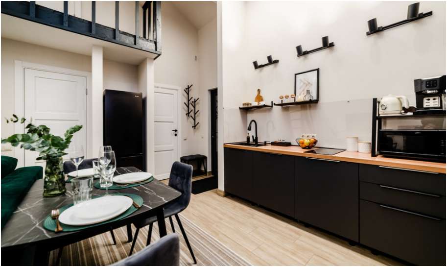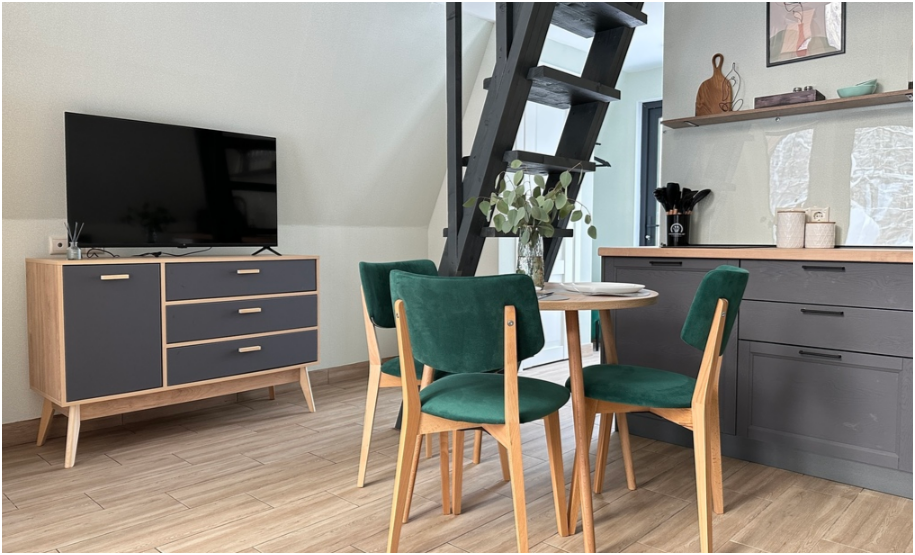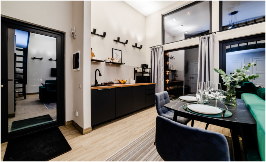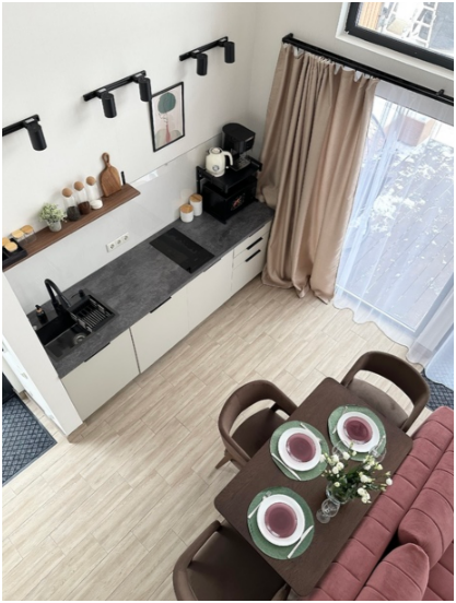 На первом этаже, просторная гостиная с диваном, телевизором, камином, кухонная зона оборудована современным кухонным гарнитуром и обеденным столом. В кухне есть: плита, холодильник с морозильником, посудомоечная машина, микроволновка, чайник, кофемашина. Так же на первом этаже есть санузел и современная ванная комната с душевой кабиной и инфракрасной сауной (бесплатно).