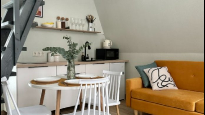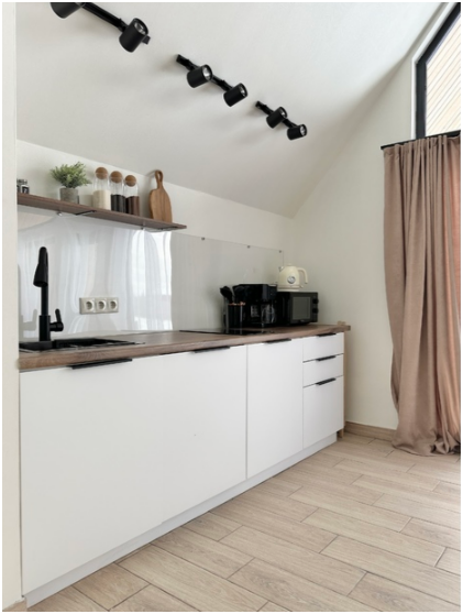 На первом этаже, просторная гостиная с диваном, телевизором, камином, кухонная зона оборудована современным кухонным гарнитуром и обеденным столом. В кухне есть: плита, холодильник с морозильником, посудомоечная машина, микроволновка, чайник, кофемашина. Так же на первом этаже есть санузел и современная ванная комната с душевой кабиной и баней на дровах. Спальня с двумя уютными односпальными кроватями. На втором этаже расположена вторая спальня.