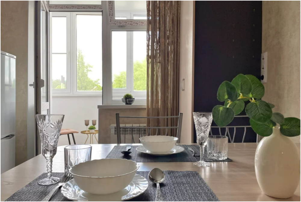 - полноценная кухня с варочной поверхностью, холодильником, СВЧ-печью, электрочайником и всей необходимой посудой и и столовыми приборами