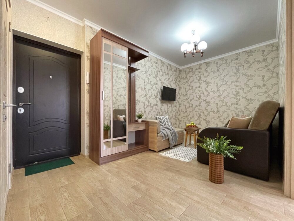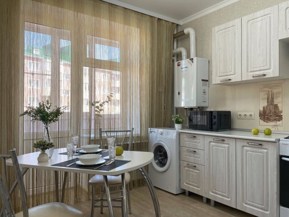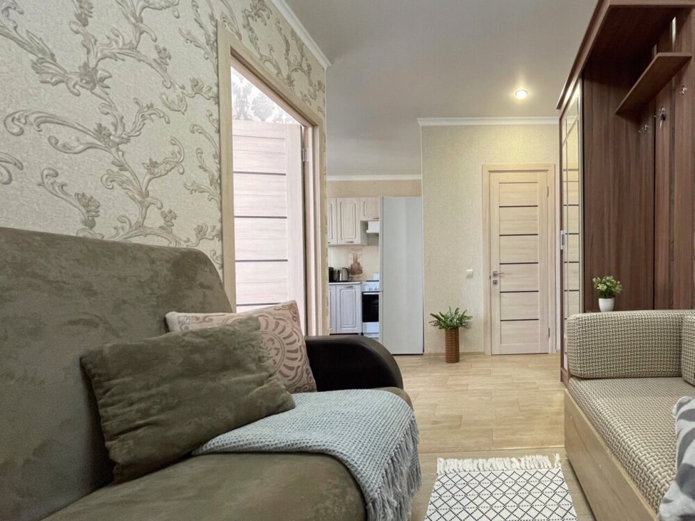 Здесь мoгут c кoмфopтом распoложиться до 5 человек (двуспальная кровать в изолированной комнате, диван на 2 спальных места в кресло кровать в гостиной совмещенной с кухней).