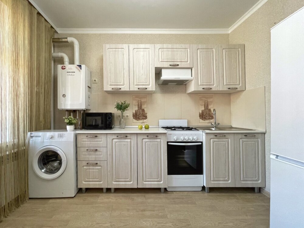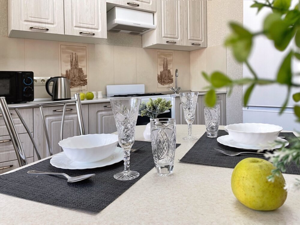 - полноценная кухня с варочной поверхностью, холодильником, СВЧ-печью, электрочайником и всей необходимой посудой и и столовыми приборами