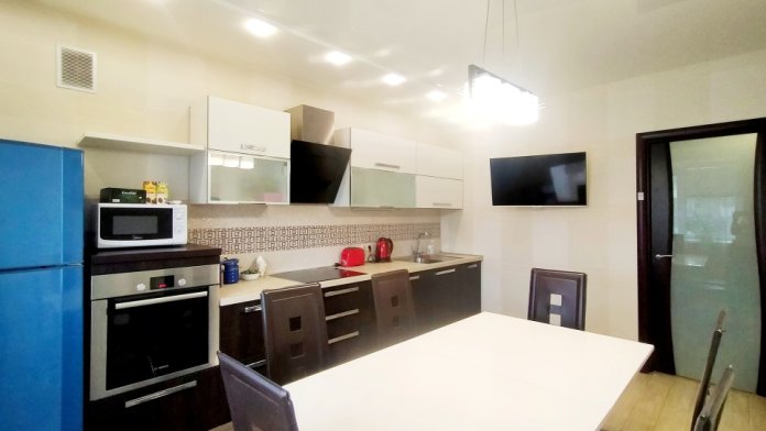 - кухня с холодильником, плитой, микроволновой печью, посудомоечной машиной, электрическим чайником, тостером и посудой
