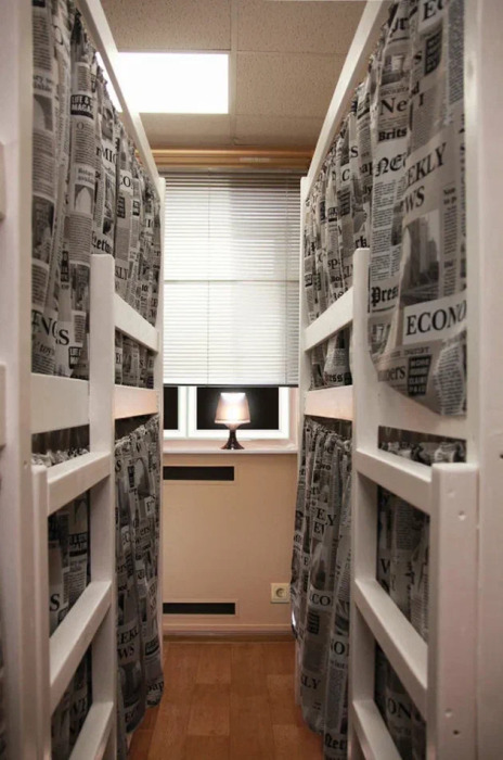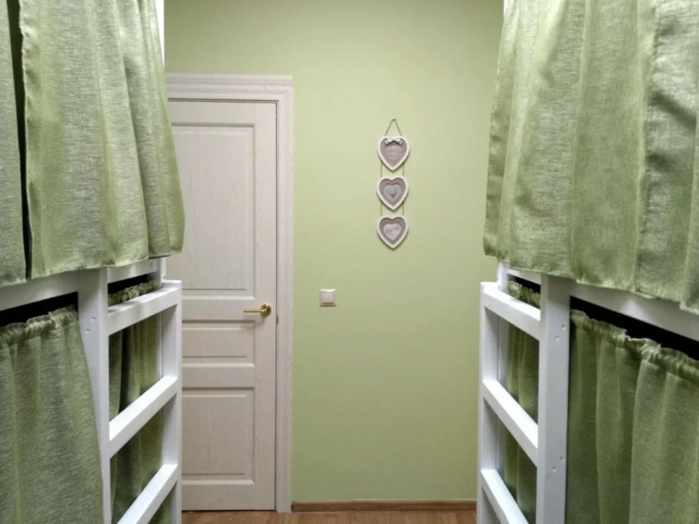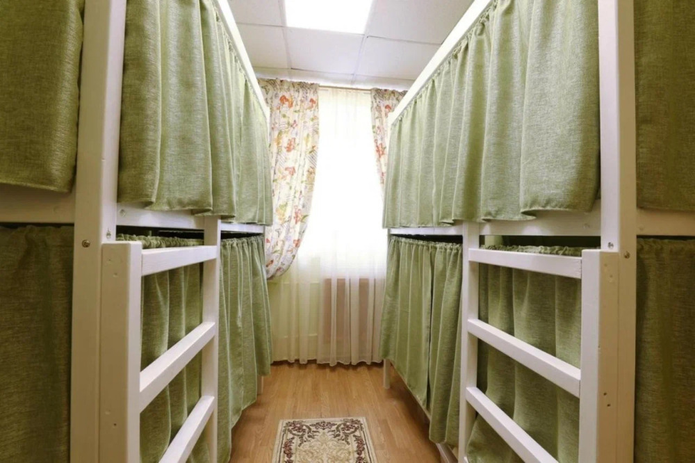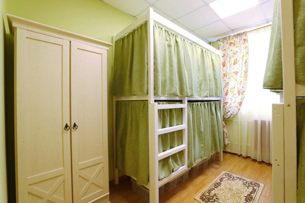 Уютный светлый шестиместный номер. В комнате 3 двухъярусные кровати со шторками и стойка для вешалок. Общий санузел. Вид из окна на тихий дворик.