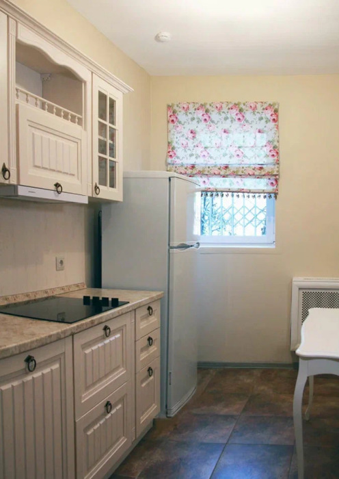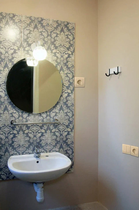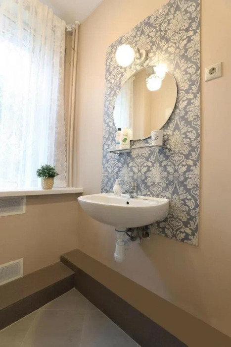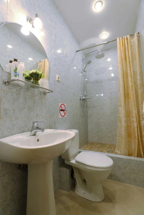Общий санузел. Уютный светлый номер с одной двухспальной кроватью. В комнате имеются две прикроватные тумбы и шкаф-гардероб. Вид из окна на тихий дворик.