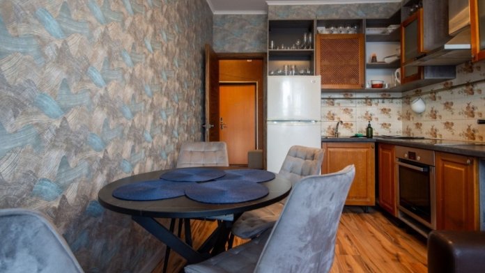 Полностью укомплектованная кухня. В квартире вся бытовая техника: телевизоры в каждой комнате, варочная поверхность, духовой шкаф, чайник, СВЧ, посуда, стиральная машина , фен, гладильные принадлежности, WiFi. В квартире окна выходят на улицу Варшавская, шторы блэкаут.