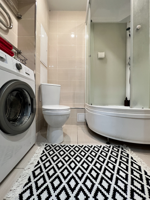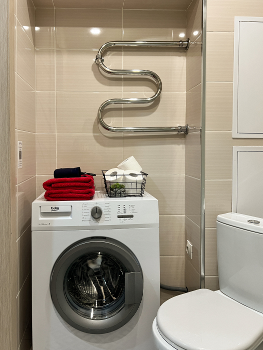 - ванная комната со средствами гигиены и стиральной машиной автомат.