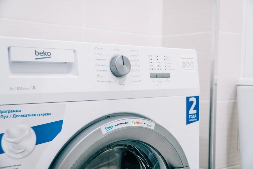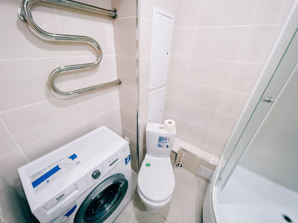 - ванная комната со средствами гигиены и стиральной машиной автомат.