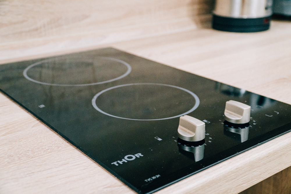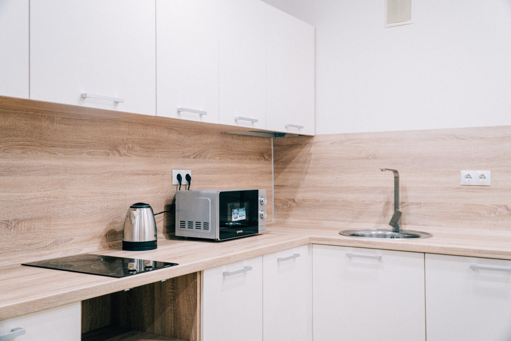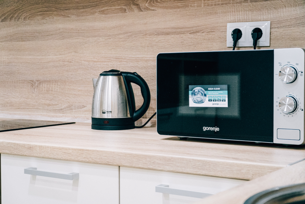 - кухня с холодильником, плитой, микроволновой печью, электрическим чайником и посудой.